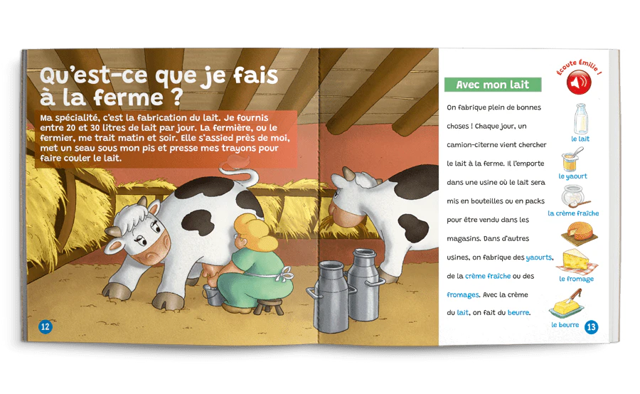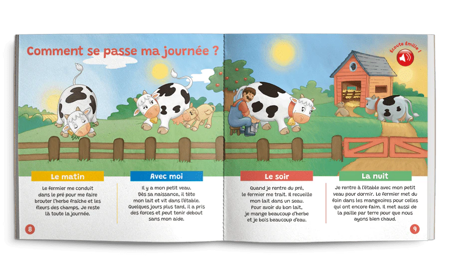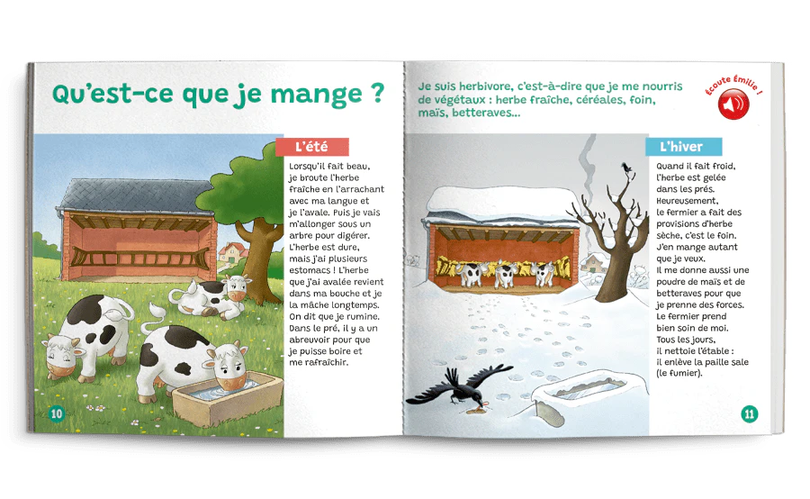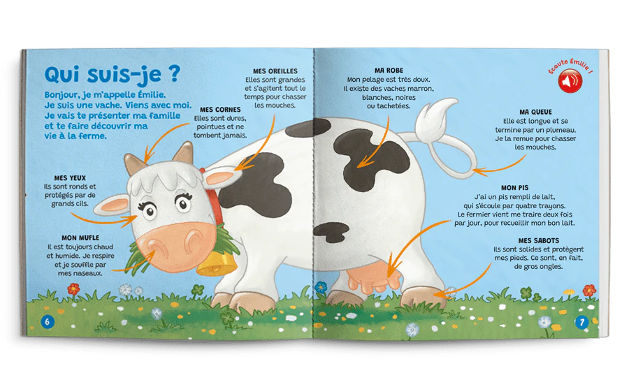Bonjour, je m’appelle Émilie. Je suis une vache. Viens avec moi. Je vais te présenter ma famille et te faire découvrir ma vie à la ferme.