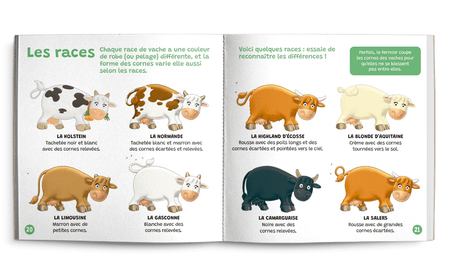 Bonjour, je suis Émilie la vache. Aujourd’hui, je vais te présenter tous les petits qui vivent dans notre ferme, ils sont nombreux et font la joie de toutes les mamans ! Le mien se dénomme « veau », il naît au printemps et son arrivée est toujours une vraie fête !