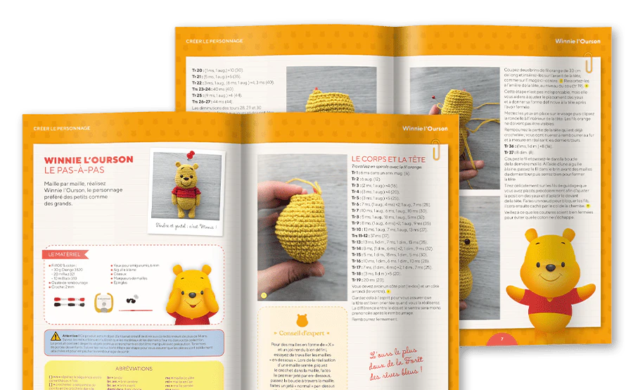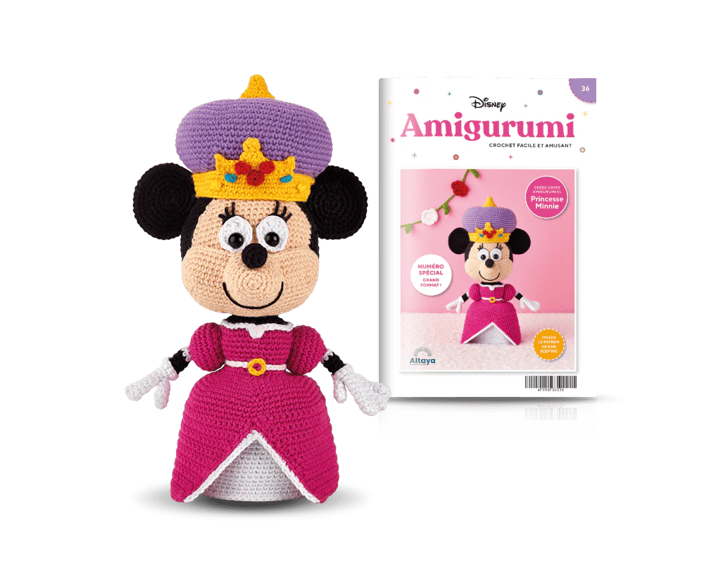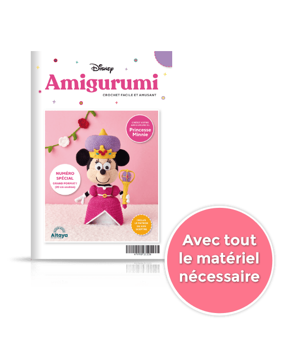 Au cours de la collection, vous recevrez trois numéros spéciaux pour créer des versions XL (environ 20cm) de vos personnages Disney préférés, parés de leurs plus beaux costumes. Chaque numéro spécial contiendra tout le nécessaire pour réaliser ces créations designées exclusivement pour la collection. Avec le premier, vous crochèterez Minnie vêtue de sa robe de princesse, et avec le second Mickey en chevalier.