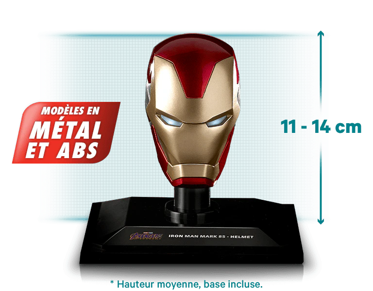 Tony Stark, connu sous le nom d’Iron Man, a conçu et construit différentes armures. Aussi spectaculaires et high-tech les unes que les autres, nombre d’entre elles n’ont été pensées que pour un usage unique. Vous recevrez les casques suivants :