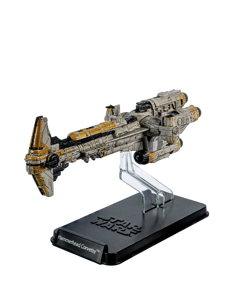 La silhouette caractéristique de la corvette Hammerhead la distingue nettement des autres croiseurs rebelles comme les fameux forceurs de blocus CR90 ou les imposantes frégates de classe Pelta.