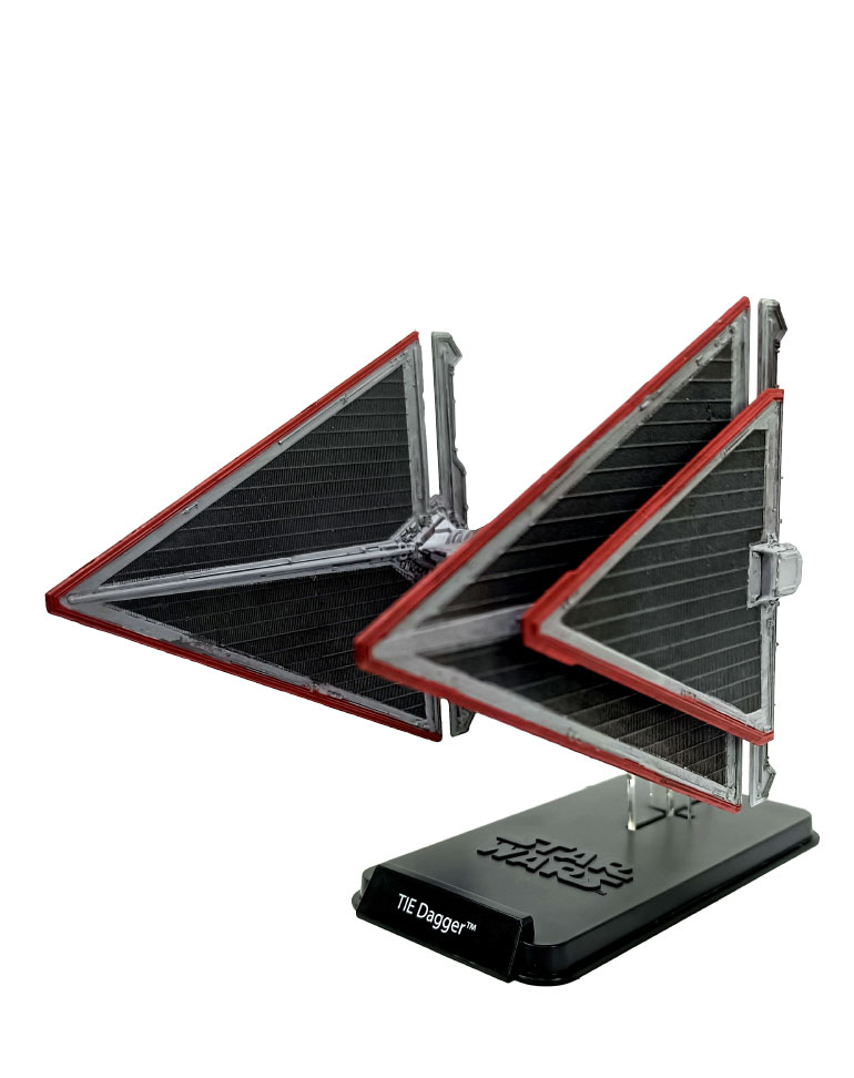 Le TIE dagger, l’une des dernières acquisitions de la flotte du Premier Ordre, est aussi redoutable au combat que le laisse présager son aspect menaçant, avec ses ailes en forme de pointe de flèche.