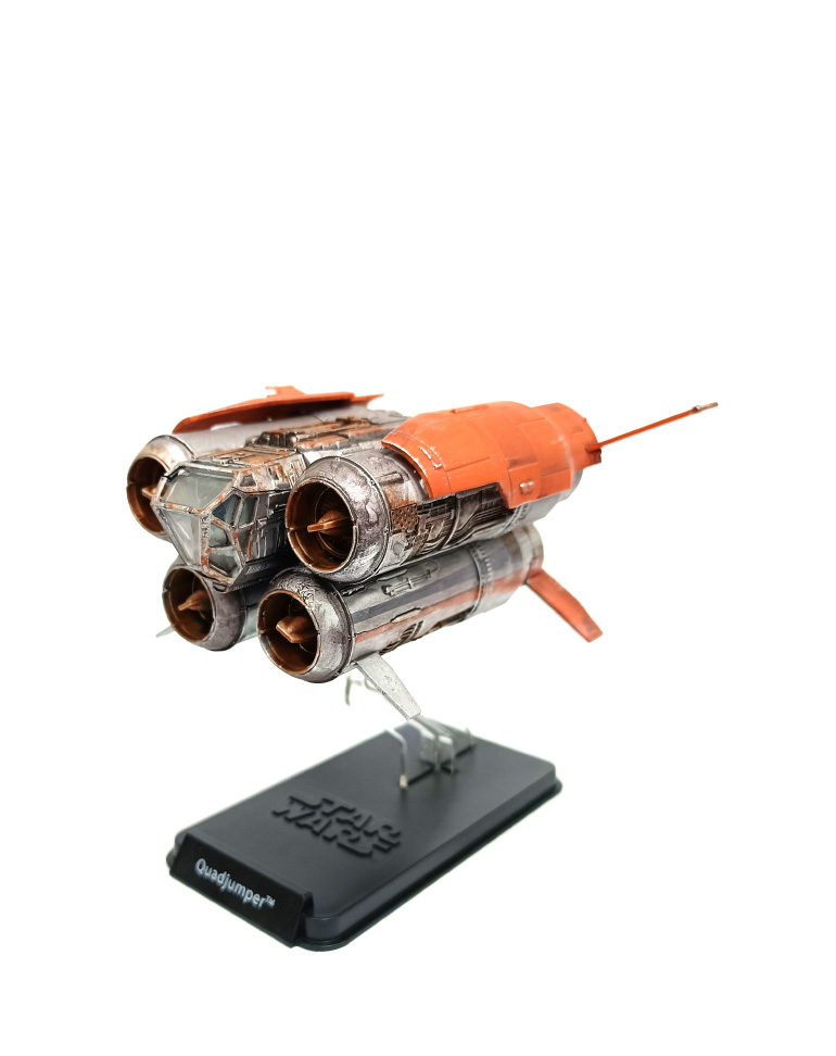 Amarré à un quai de l’avant-poste de Niima, le quadjumper est le véhicule idéal pour que Rey et Finn échappent au Premier Ordre, mais il est détruit par des chasseurs TIE.