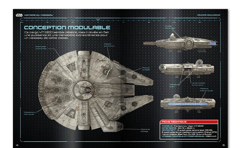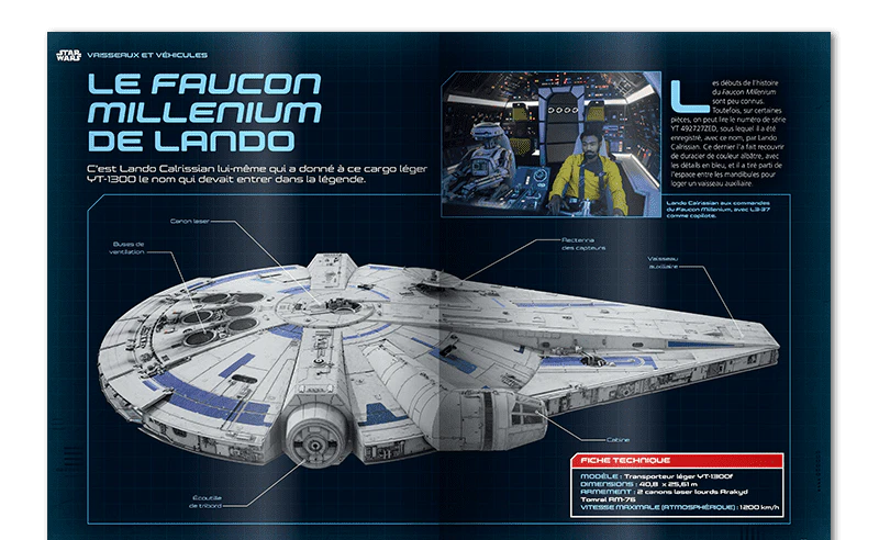Quelle est la taille d’un Imperial Star Destroyer ? Qui fabrique les transports de troupes ? Qu’a de spécial le chasseur Tie Advanced X1 Prototype de Dark Vador ? Découvrez les détails des vaisseaux et des véhicules de Star Wars et revivez les moments phares de leur apparition. Cette section comprend des schémas et des illustrations de chaque vaisseau ou véhicule présenté.