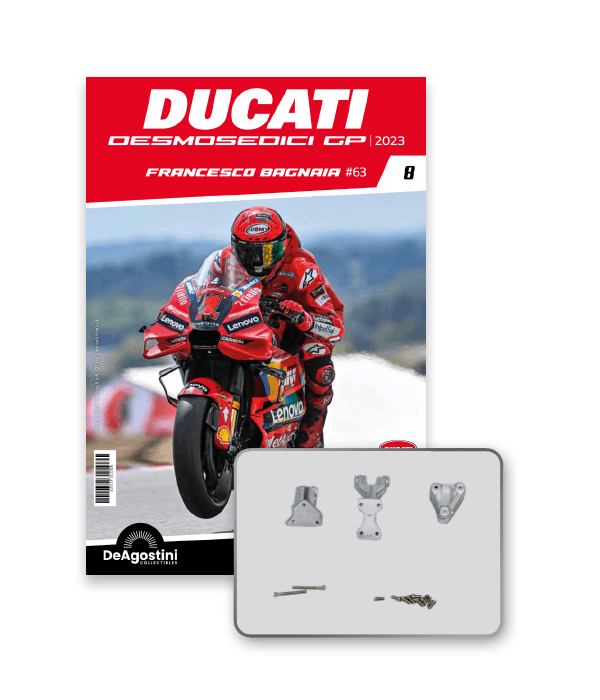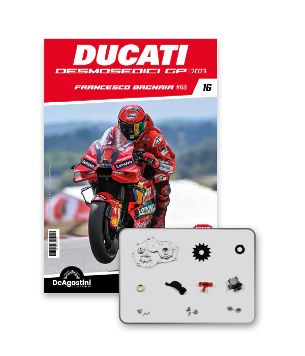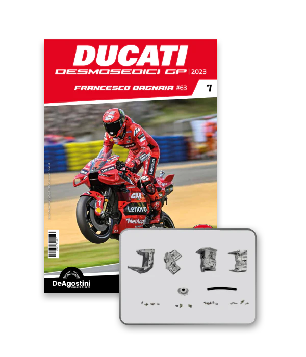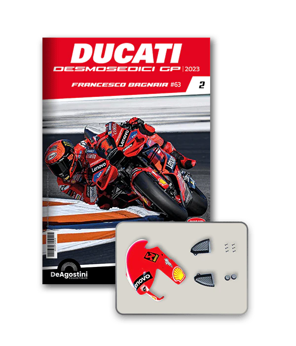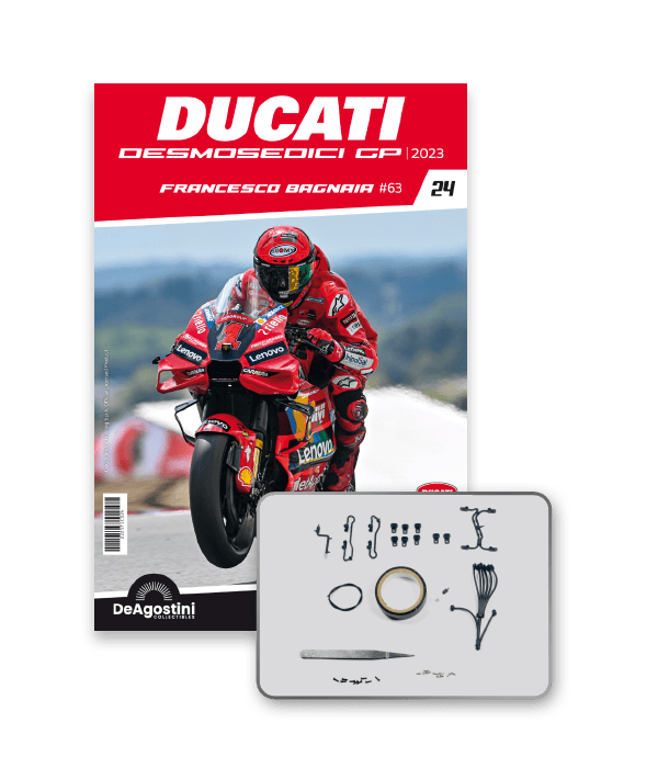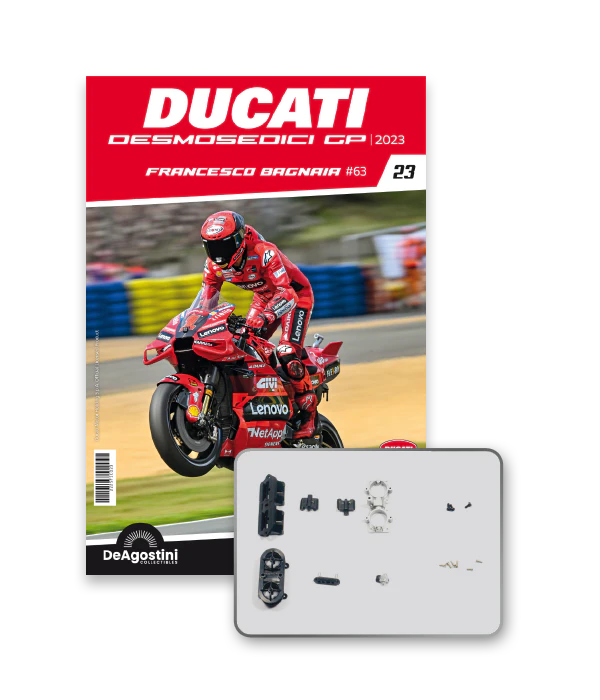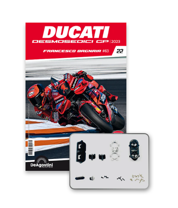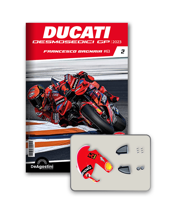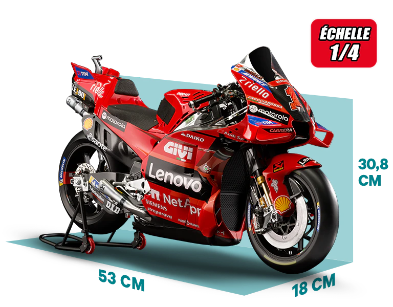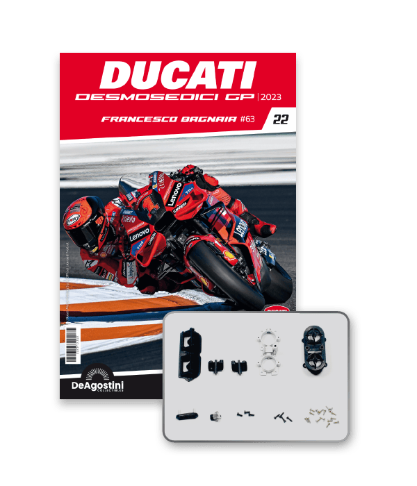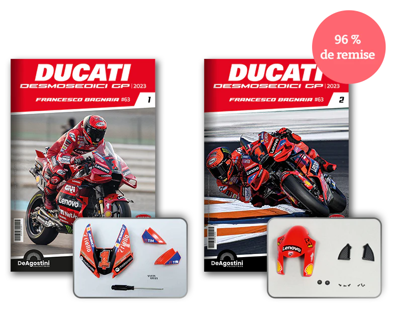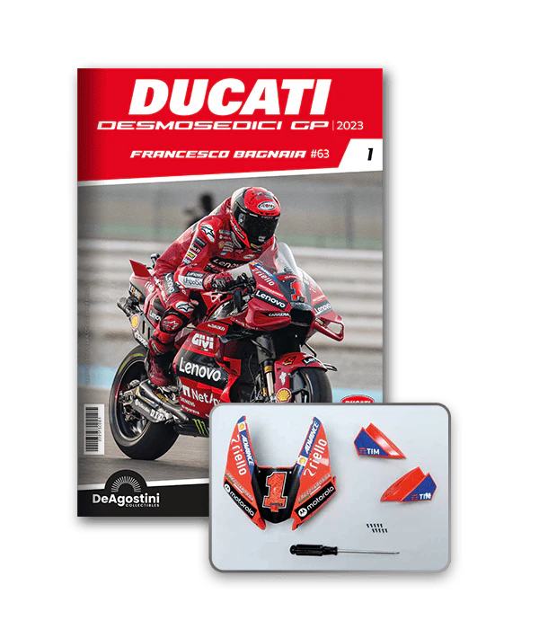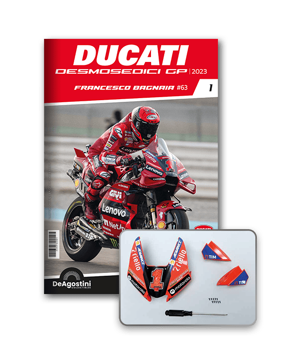 Construisez la moto du champion du monde : une réplique exclusive et fidèle à l'échelle 1/4 de la légendaire DUCATI DESMOSEDICI GP23 de FRANCESCO BAGNAIA ! La moto qui a démontré la maîtrise technologique d’un moteur V4 ultra-performant : l’évolution de la GP22 qui a régné sur les circuits et éveillé des émotions exceptionnelles.