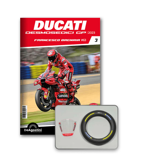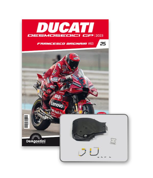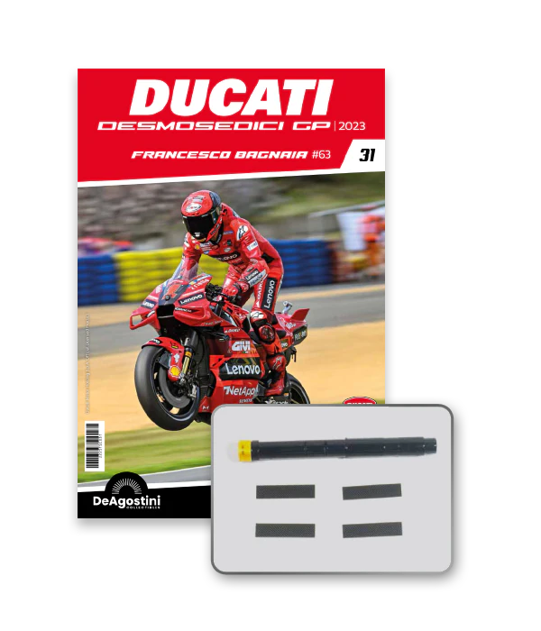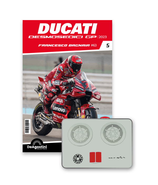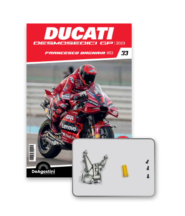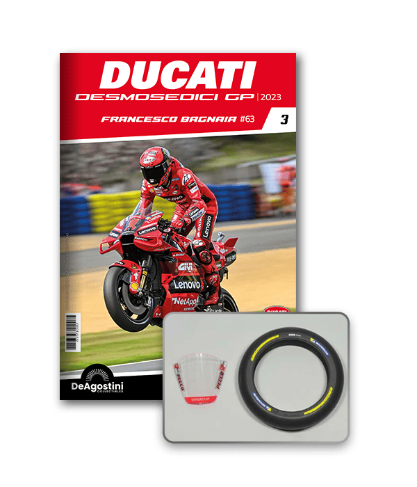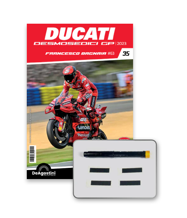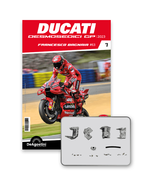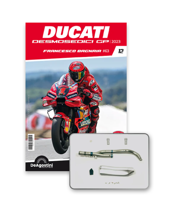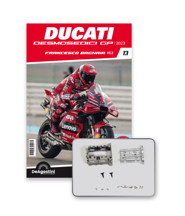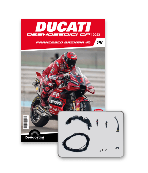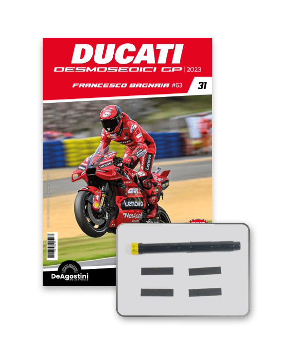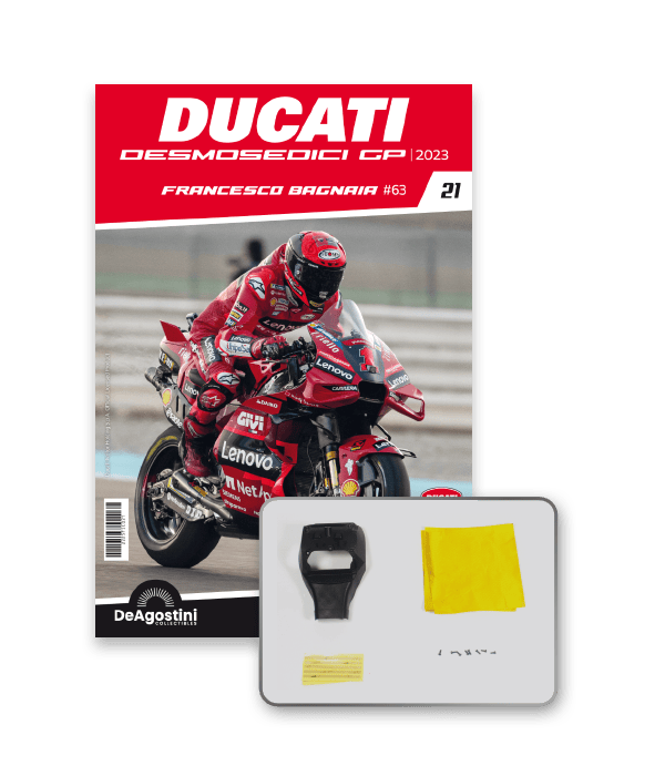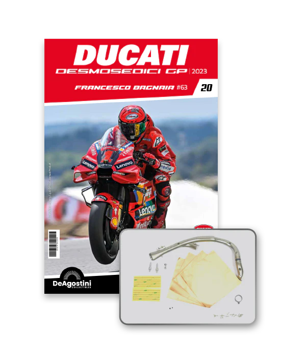 Construisez la moto du champion du monde : une réplique exclusive et fidèle à l'échelle 1/4 de la légendaire DUCATI DESMOSEDICI GP23 de FRANCESCO BAGNAIA ! La moto qui a démontré la maîtrise technologique d’un moteur V4 ultra-performant : l’évolution de la GP22 qui a régné sur les circuits et éveillé des émotions exceptionnelles.