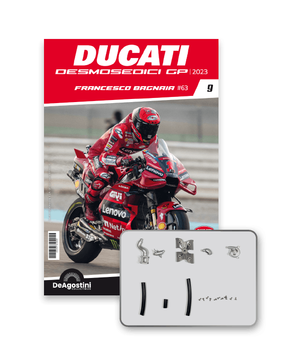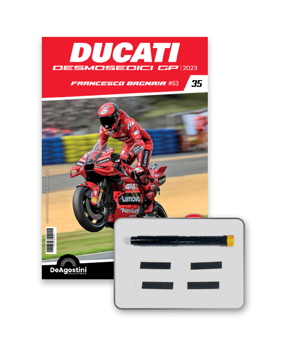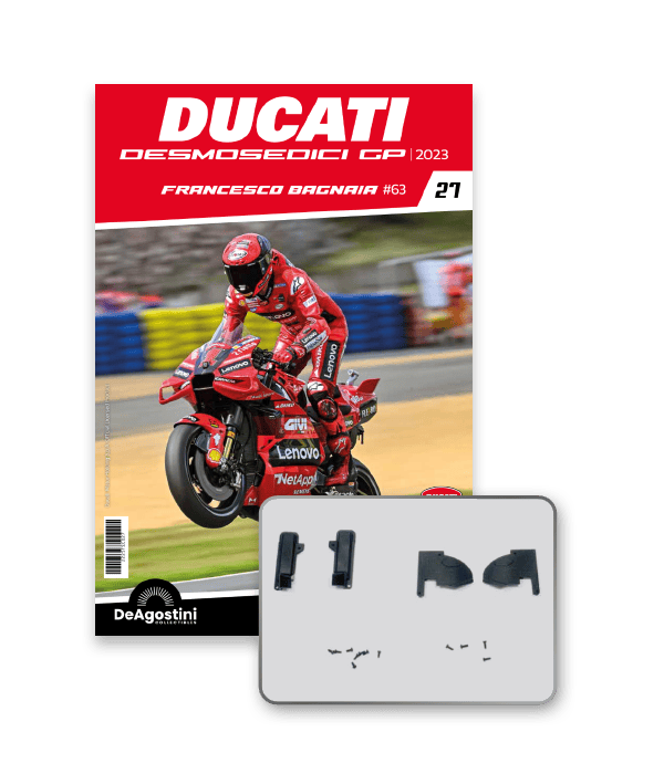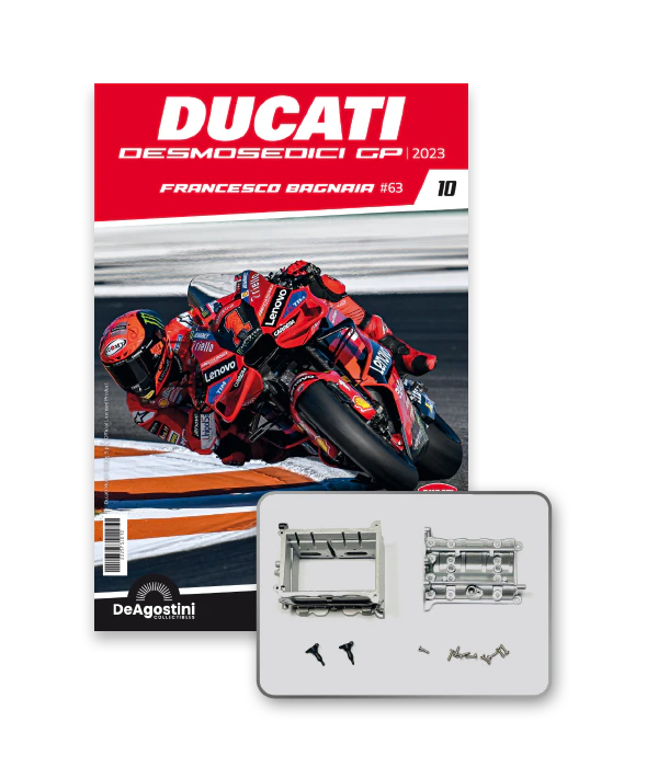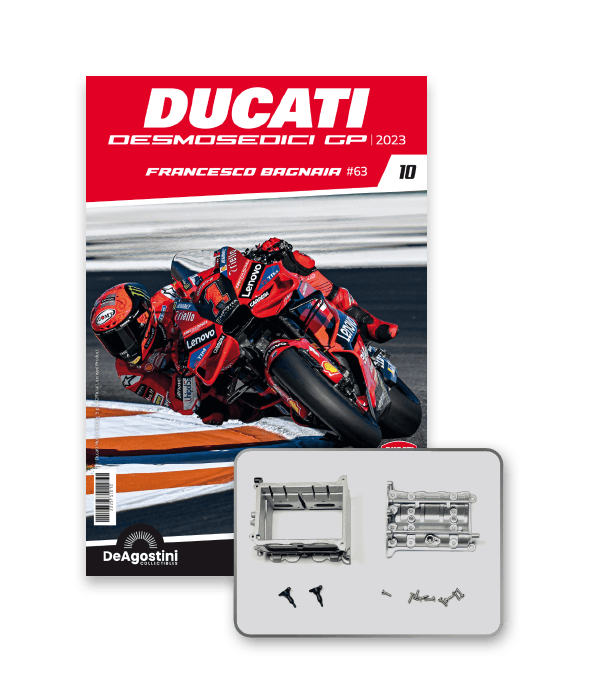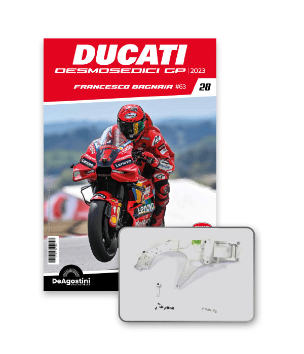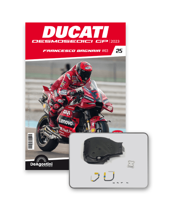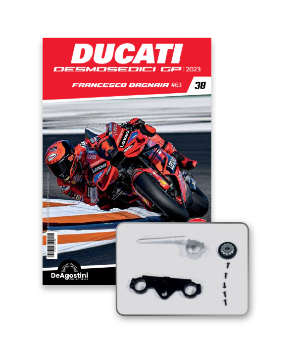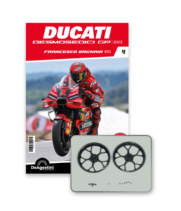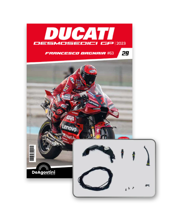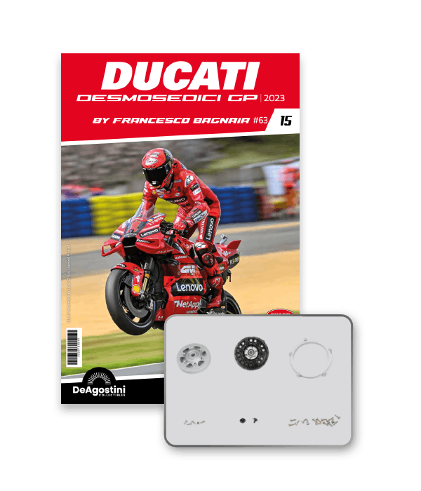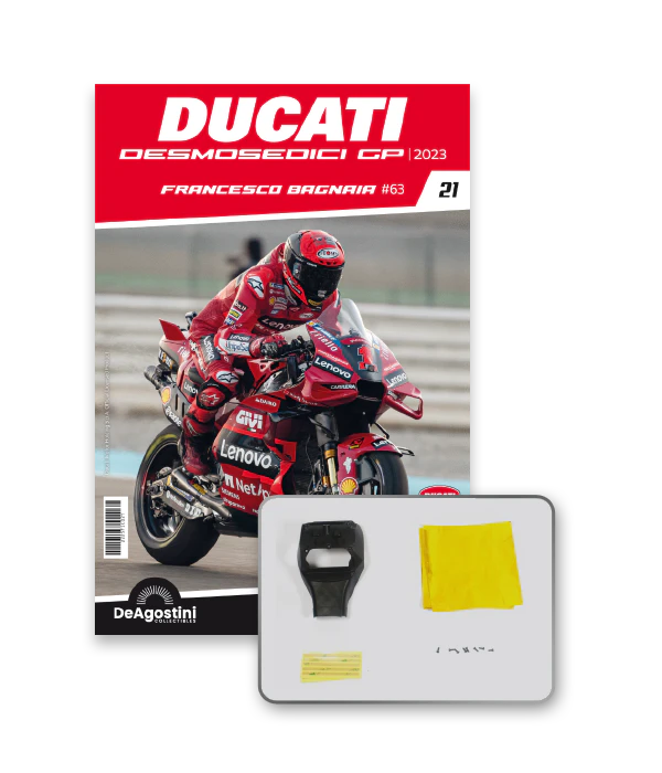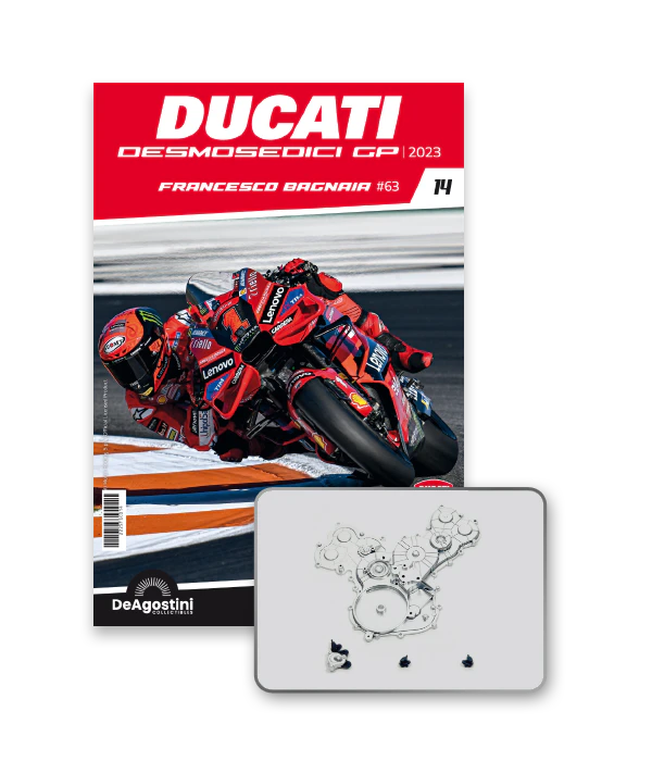 Construisez la moto du champion du monde : une réplique exclusive et fidèle à l'échelle 1/4 de la légendaire DUCATI DESMOSEDICI GP23 de FRANCESCO BAGNAIA ! La moto qui a démontré la maîtrise technologique d’un moteur V4 ultra-performant : l’évolution de la GP22 qui a régné sur les circuits et éveillé des émotions exceptionnelles.
