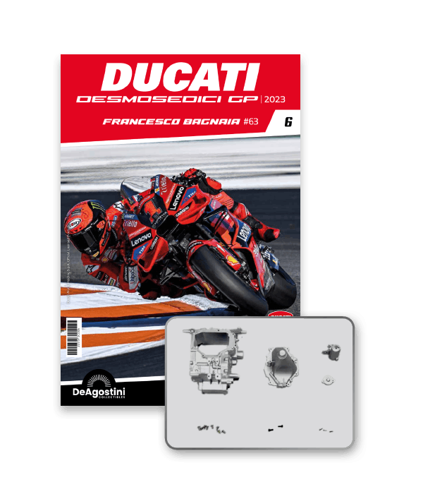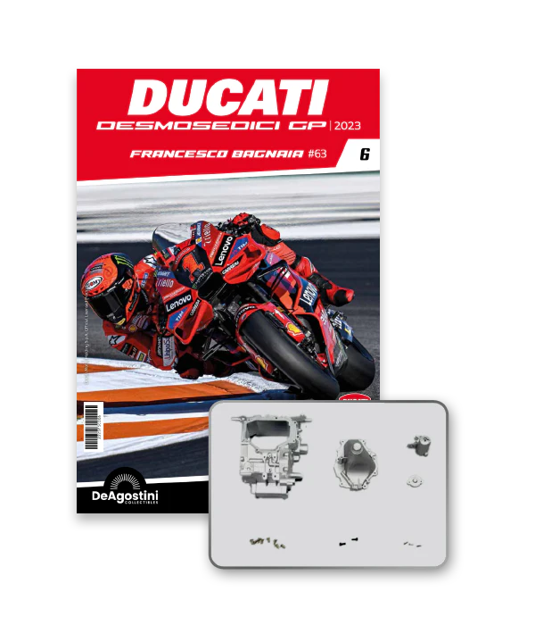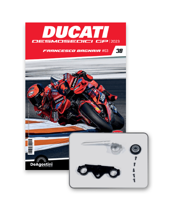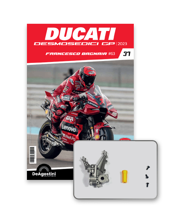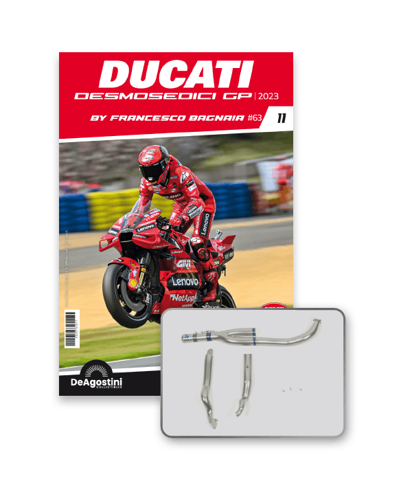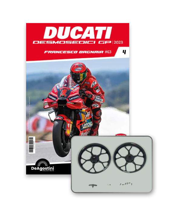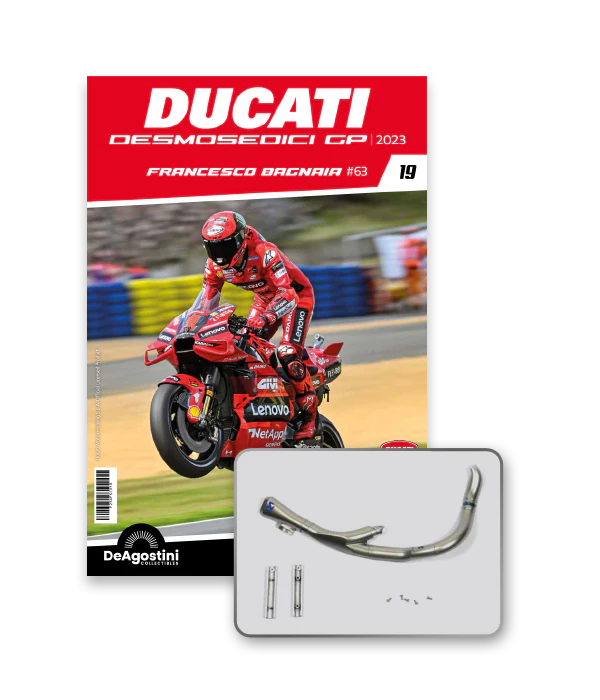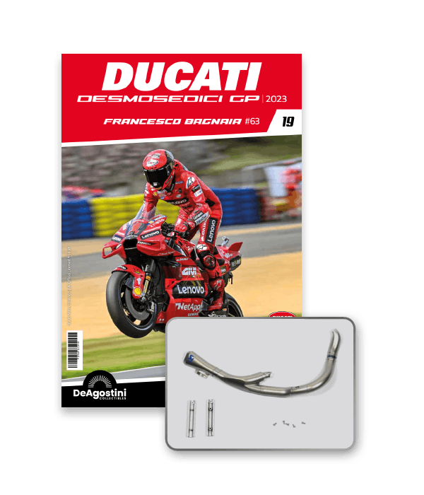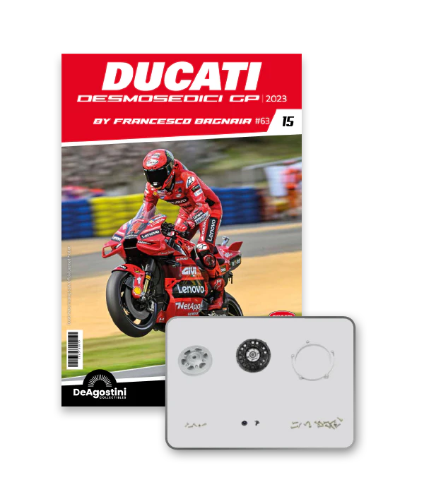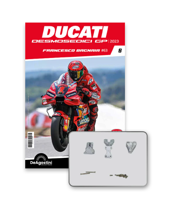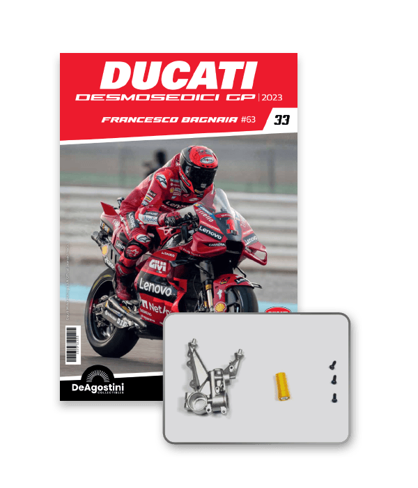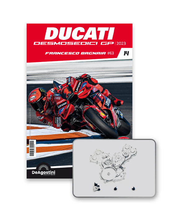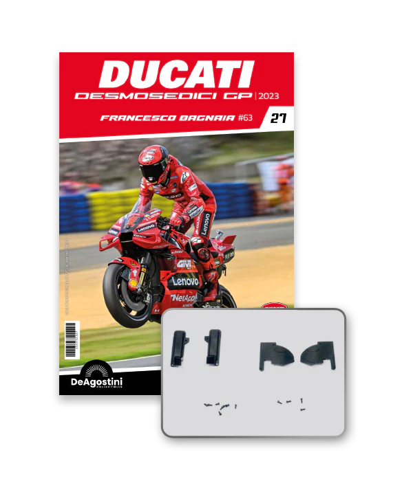 Construisez la moto du champion du monde : une réplique exclusive et fidèle à l'échelle 1/4 de la légendaire DUCATI DESMOSEDICI GP23 de FRANCESCO BAGNAIA ! La moto qui a démontré la maîtrise technologique d’un moteur V4 ultra-performant : l’évolution de la GP22 qui a régné sur les circuits et éveillé des émotions exceptionnelles.