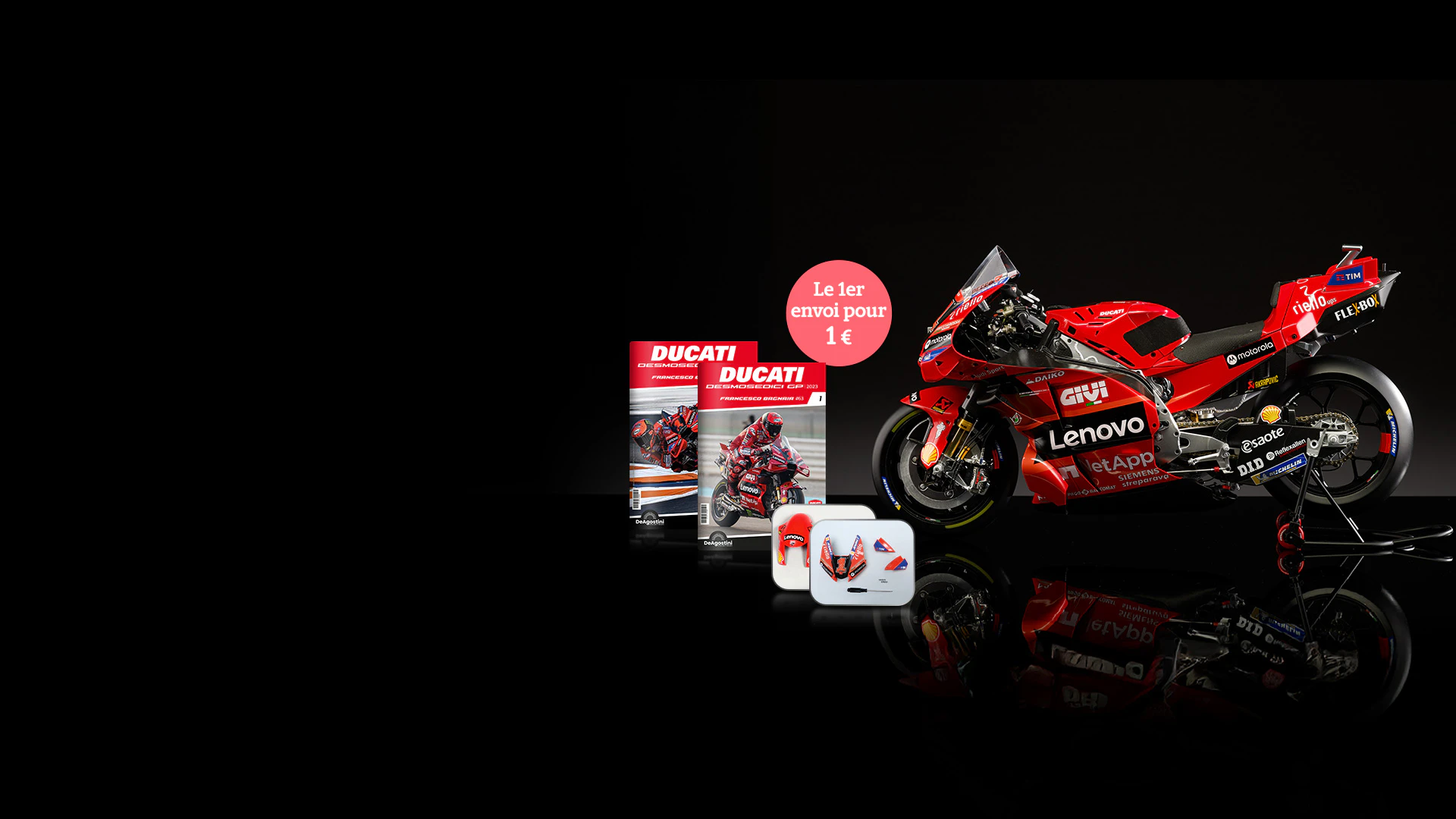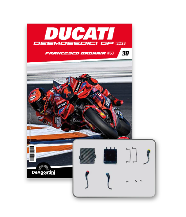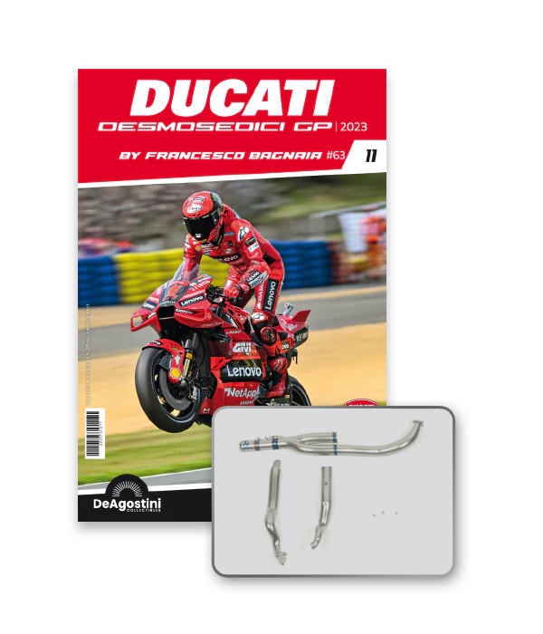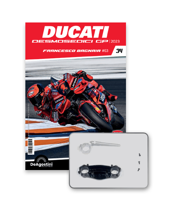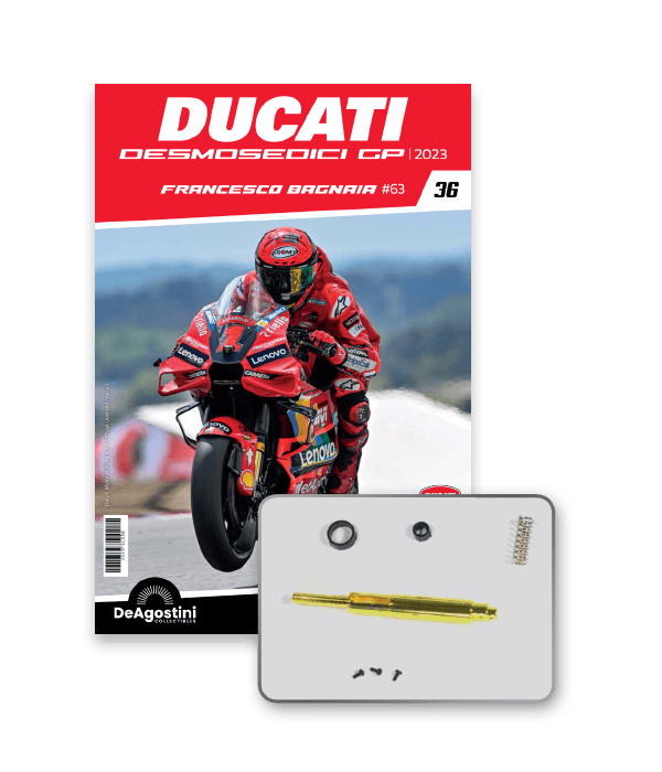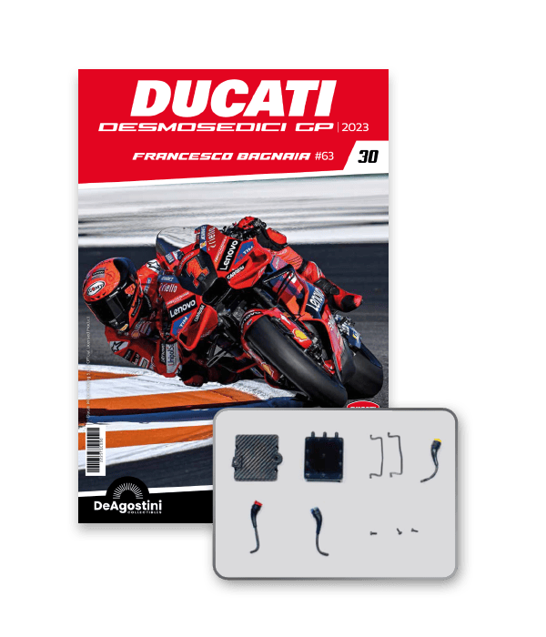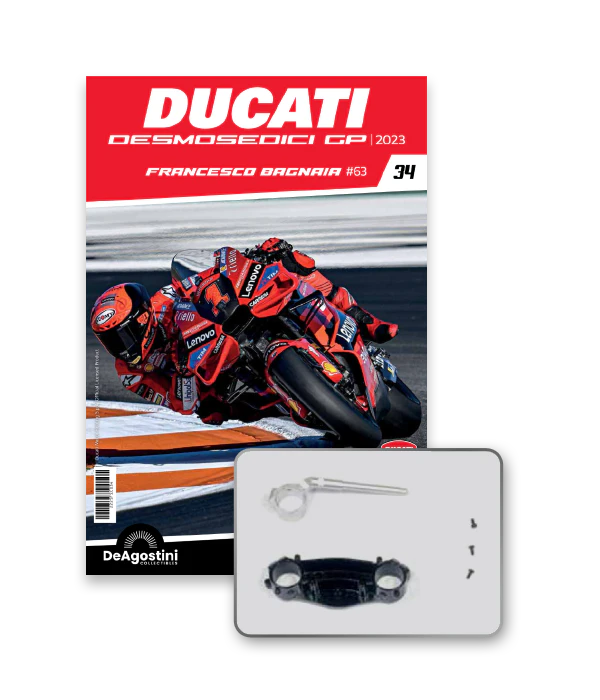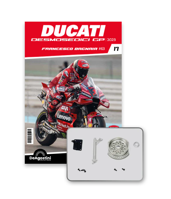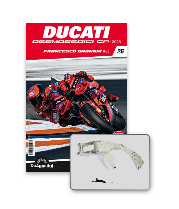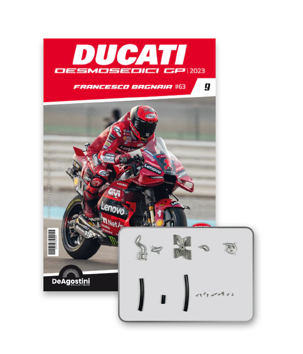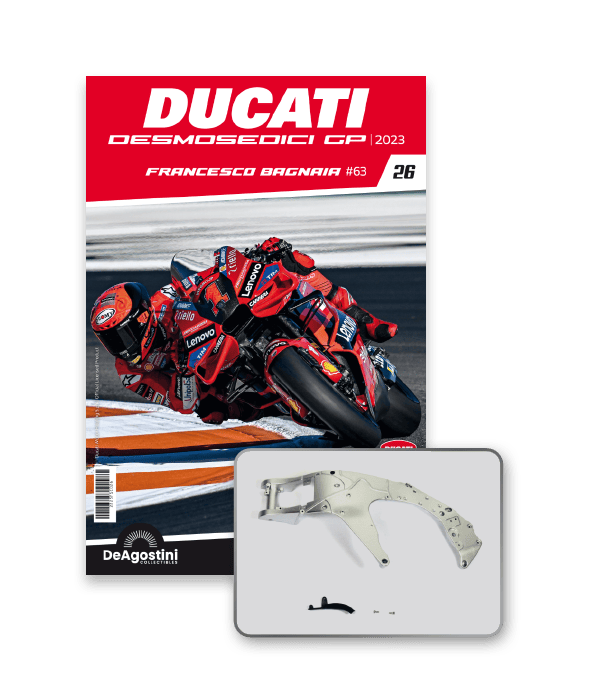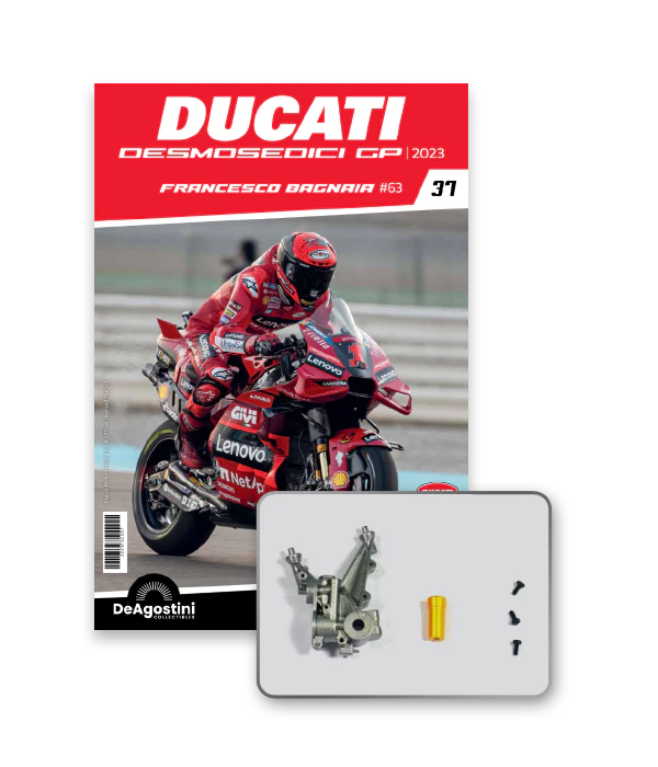 Construisez la moto du champion du monde : une réplique exclusive et fidèle à l'échelle 1/4 de la légendaire DUCATI DESMOSEDICI GP23 de FRANCESCO BAGNAIA ! La moto qui a démontré la maîtrise technologique d’un moteur V4 ultra-performant : l’évolution de la GP22 qui a régné sur les circuits et éveillé des émotions exceptionnelles.