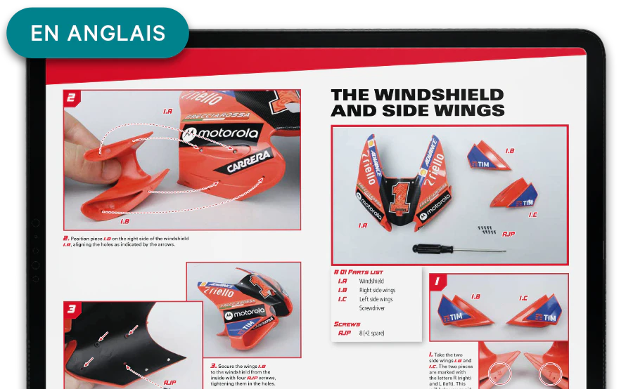 Des instructions claires et précises, accompagnées d’images pas à pas, vous permettent de construire facilement votre superbe modèle de DUCATI DESMOSEDICI GP23.