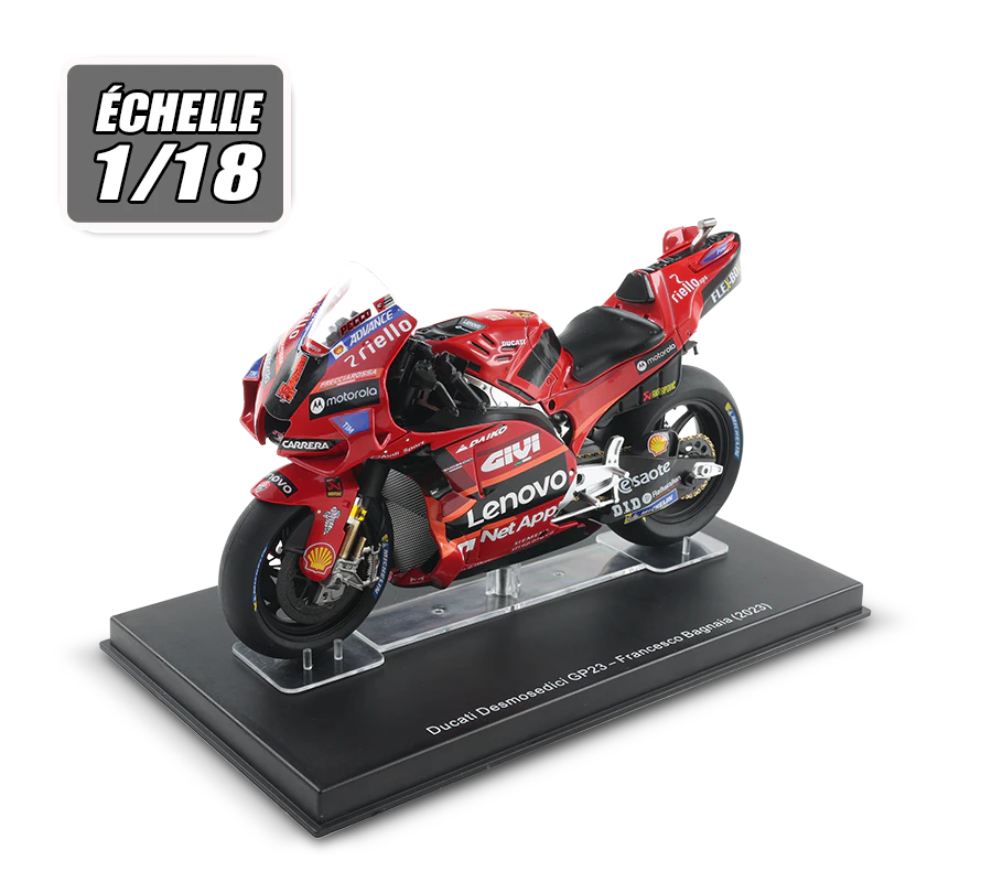 Une superbe réplique de la DUCATI Desmosedici GP23 à l’échelle 1:18 pour compléter votre modèle.