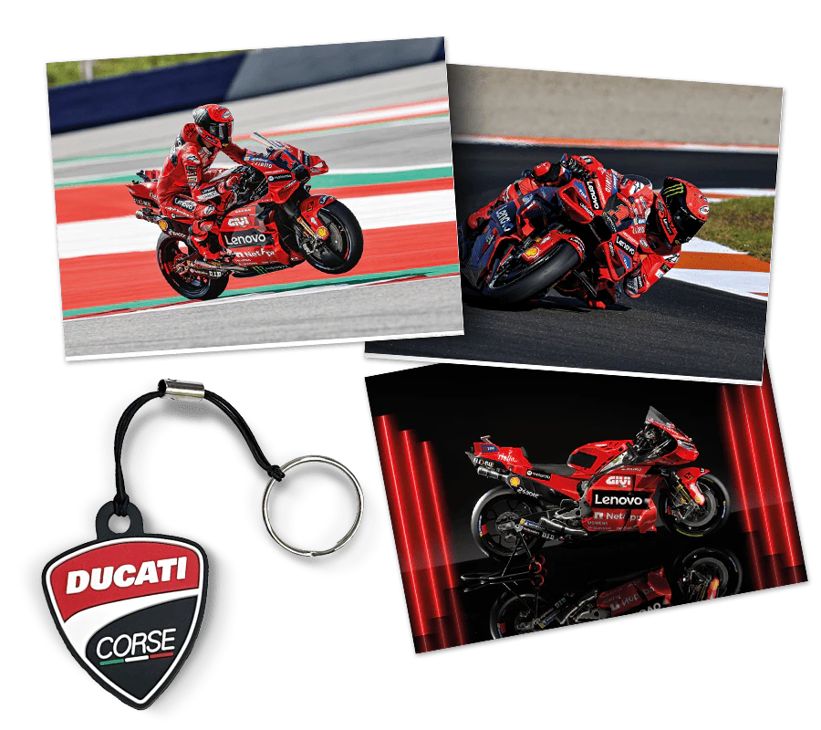 Les posters célèbrent les victoires de la DUCATI Desmosedici GP23, et le porte-clés est parfait pour être porté sur soi à tout moment.