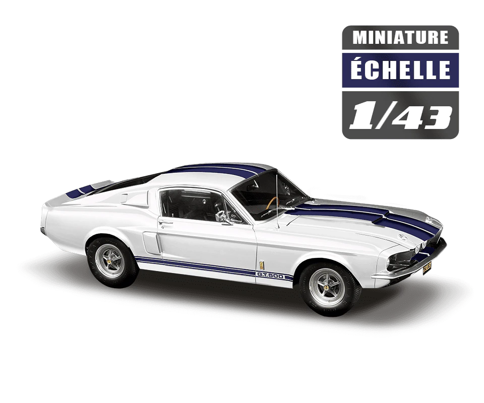 Une autre couleur très populaire de la Ford Mustang Shelby GT500® était le blanc avec ses deux franges bleu marine. Retrouvez cette combinaison emblématique avec cette miniature au 1/43e.
