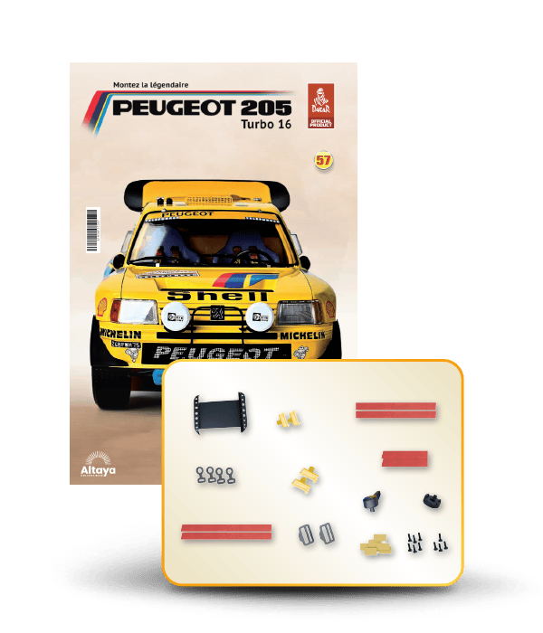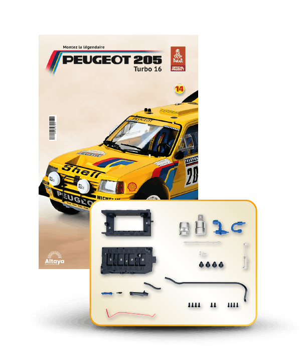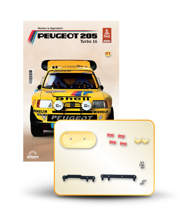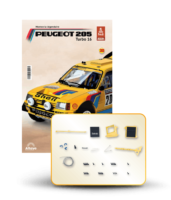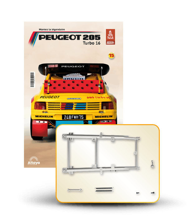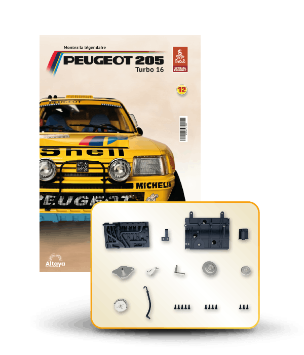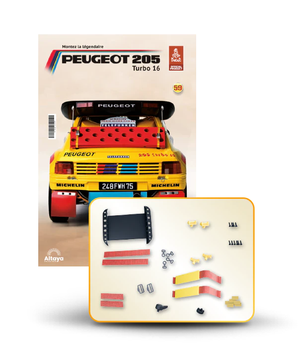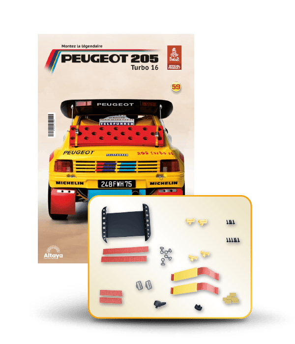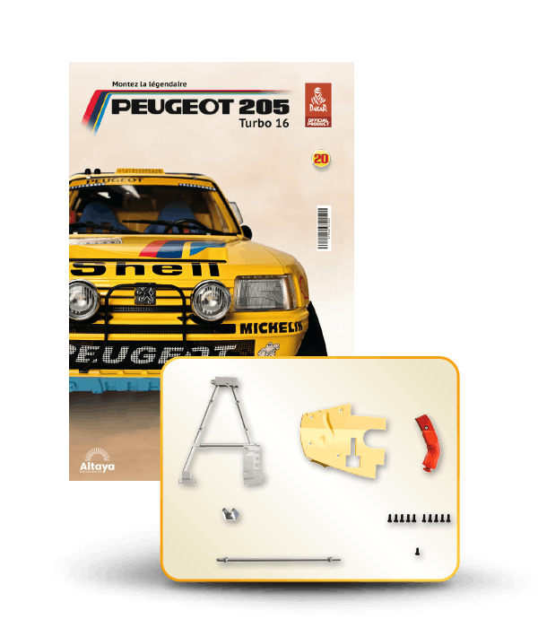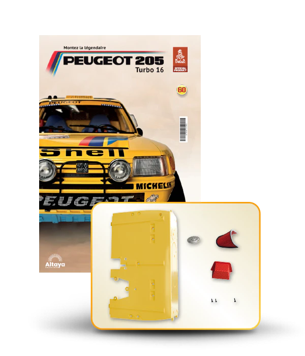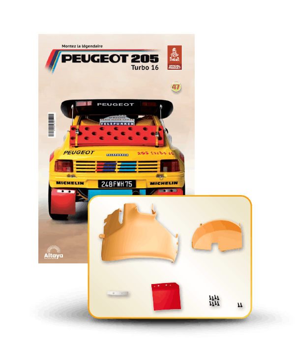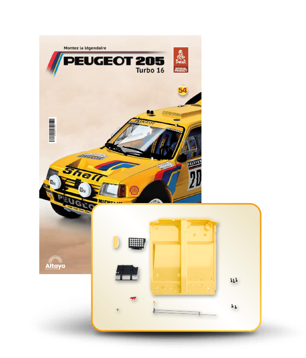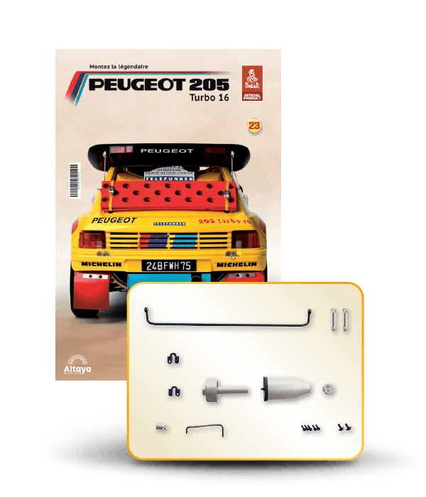 Vous pouvez désormais construire votre propre modèle à l'échelle 1/8 de la spectaculaire Peugeot 205 Turbo 16 Grand Raid, vainqueur du rallye Paris-Dakar 1987, pilotée par Ari Vatanen et Bernard Giroux. Ce modèle inédit vient agrandir la prestigieuse galaxie des modèles réduits à monter. Prenez plaisir l'assembler et à l'exposer dans un endroit bien visible de votre maison.