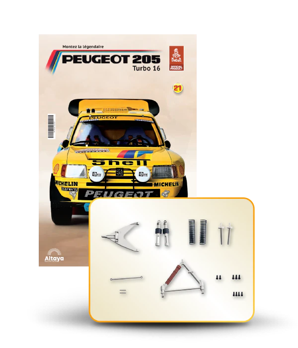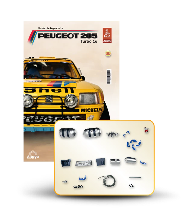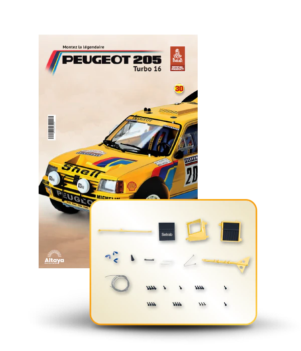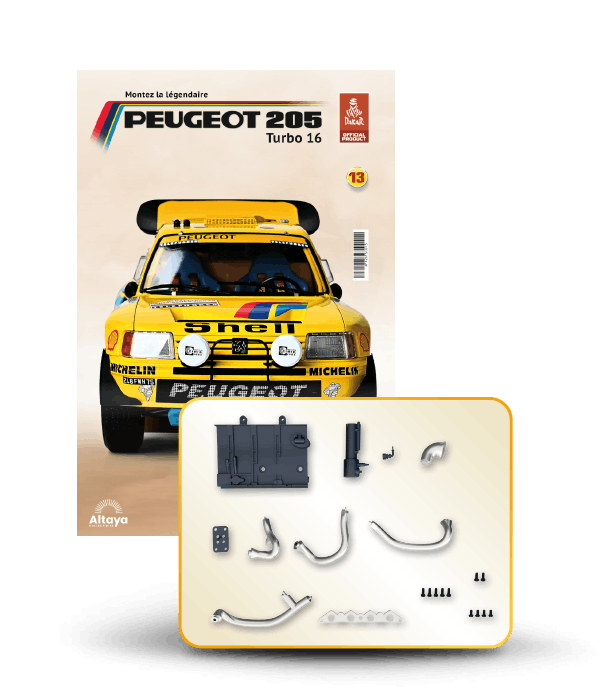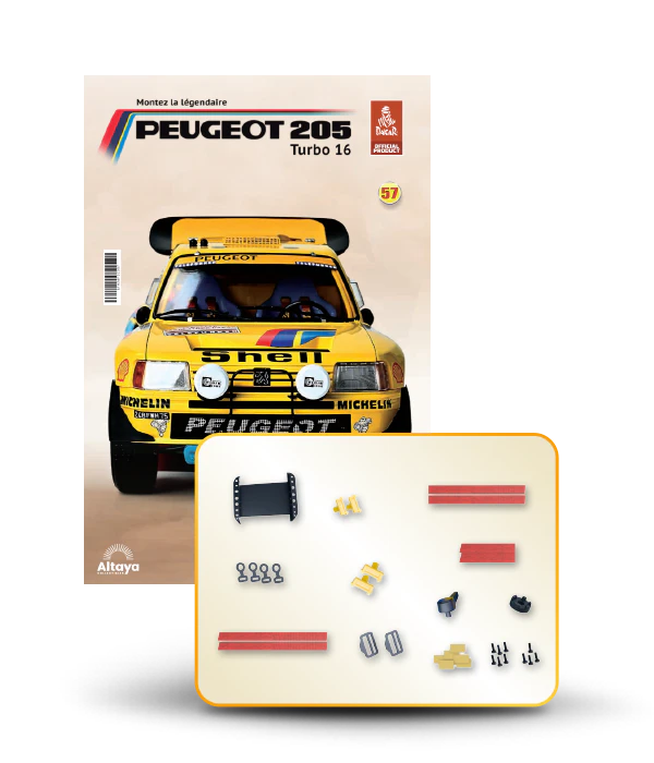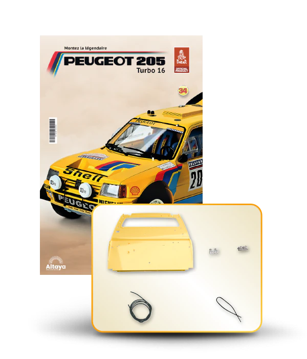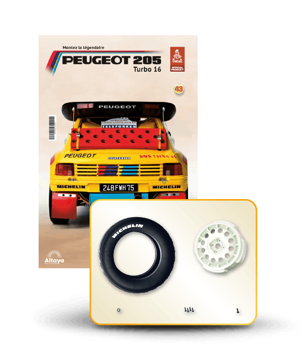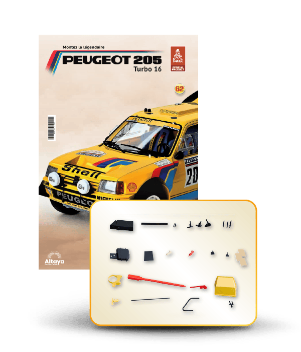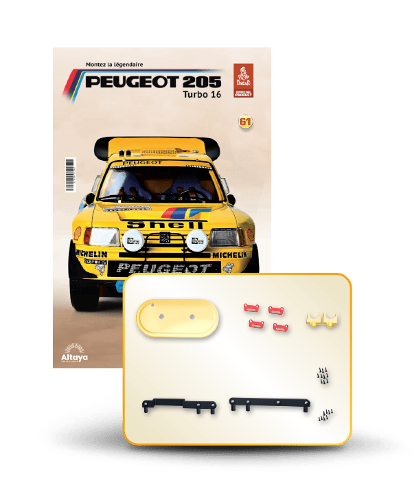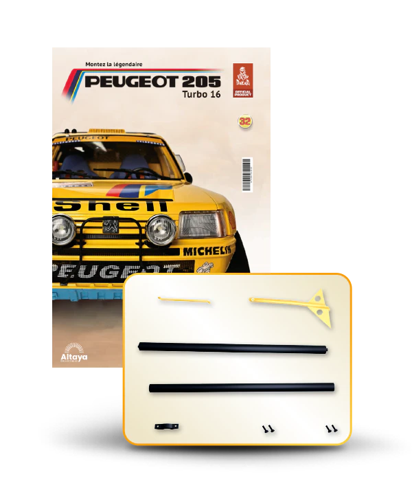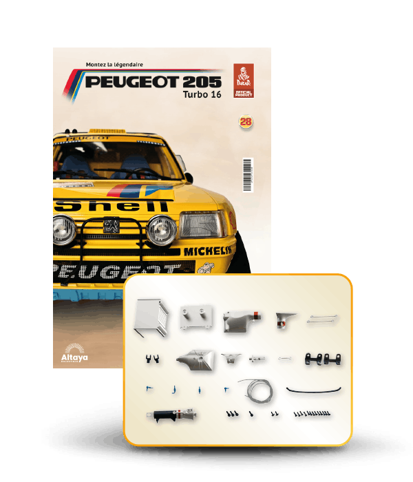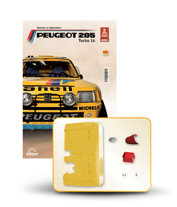 Vous pouvez désormais construire votre propre modèle à l'échelle 1/8 de la spectaculaire Peugeot 205 Turbo 16 Grand Raid, vainqueur du rallye Paris-Dakar 1987, pilotée par Ari Vatanen et Bernard Giroux. Ce modèle inédit vient agrandir la prestigieuse galaxie des modèles réduits à monter. Prenez plaisir l'assembler et à l'exposer dans un endroit bien visible de votre maison.