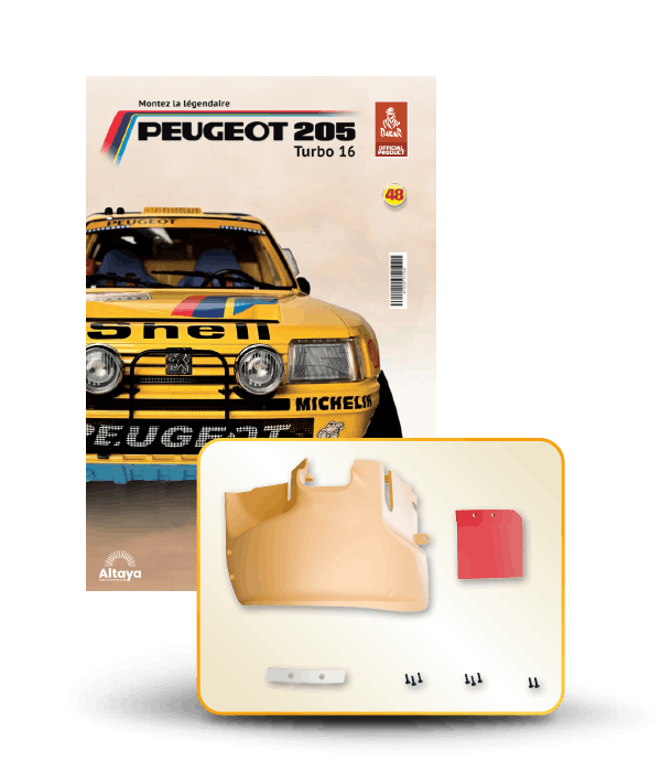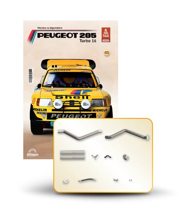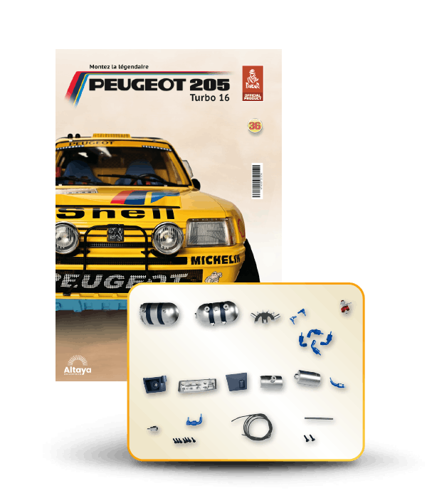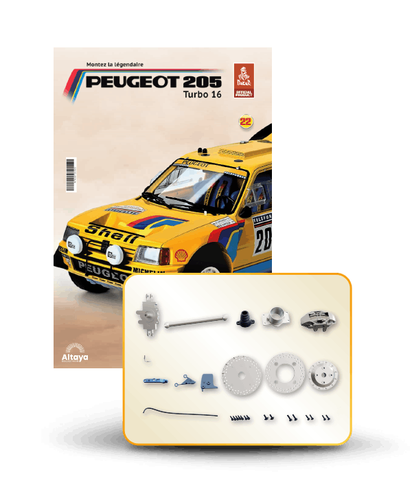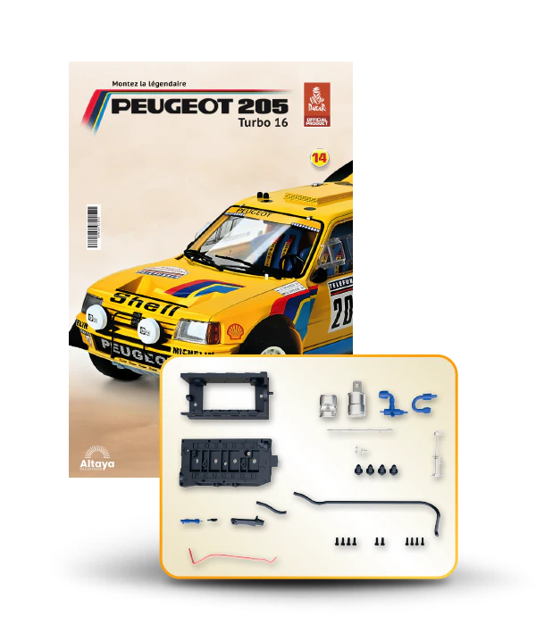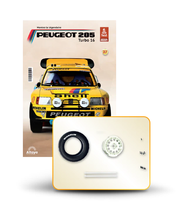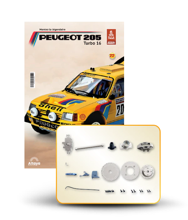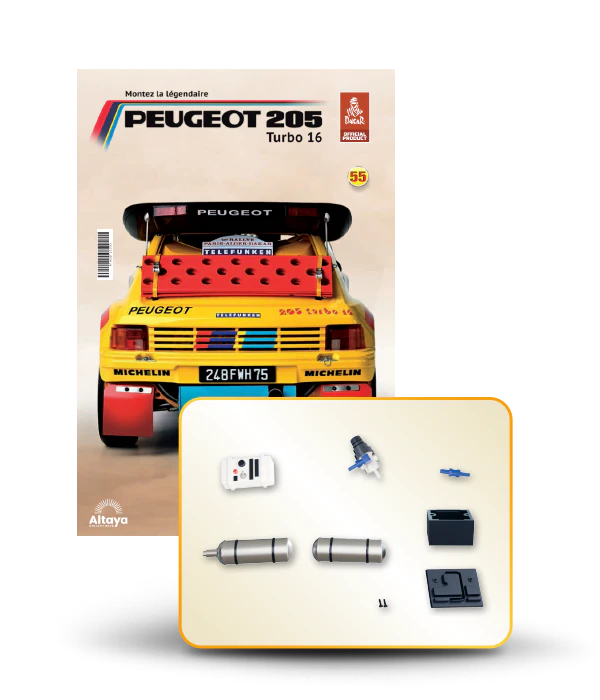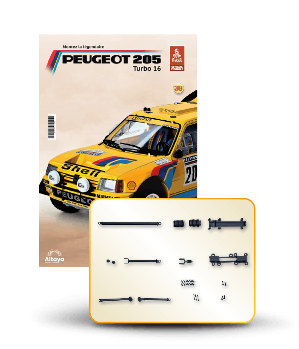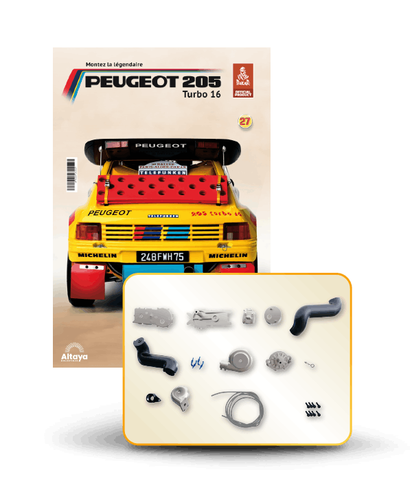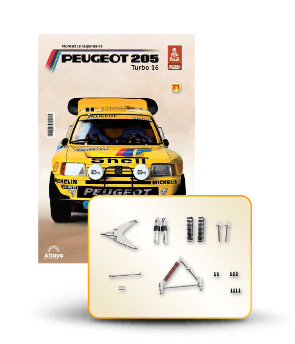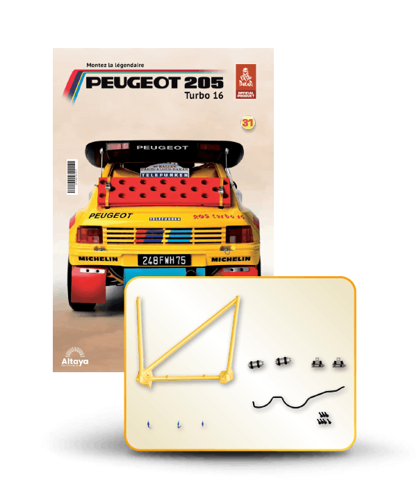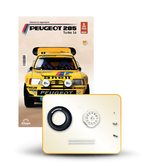 Vous pouvez désormais construire votre propre modèle à l'échelle 1/8 de la spectaculaire Peugeot 205 Turbo 16 Grand Raid, vainqueur du rallye Paris-Dakar 1987, pilotée par Ari Vatanen et Bernard Giroux. Ce modèle inédit vient agrandir la prestigieuse galaxie des modèles réduits à monter. Prenez plaisir l'assembler et à l'exposer dans un endroit bien visible de votre maison.