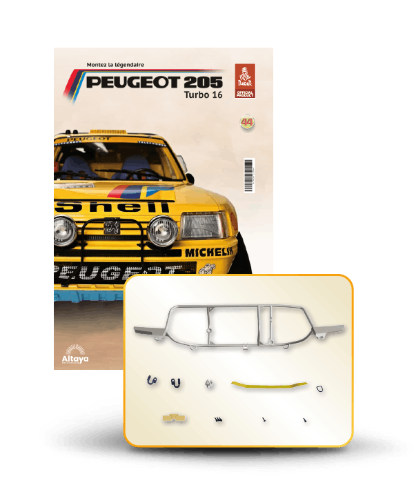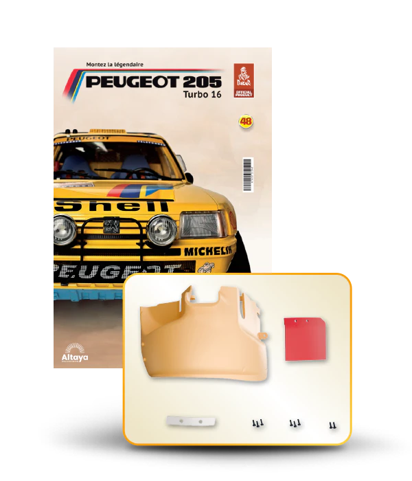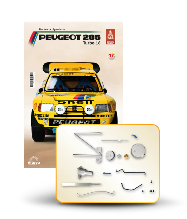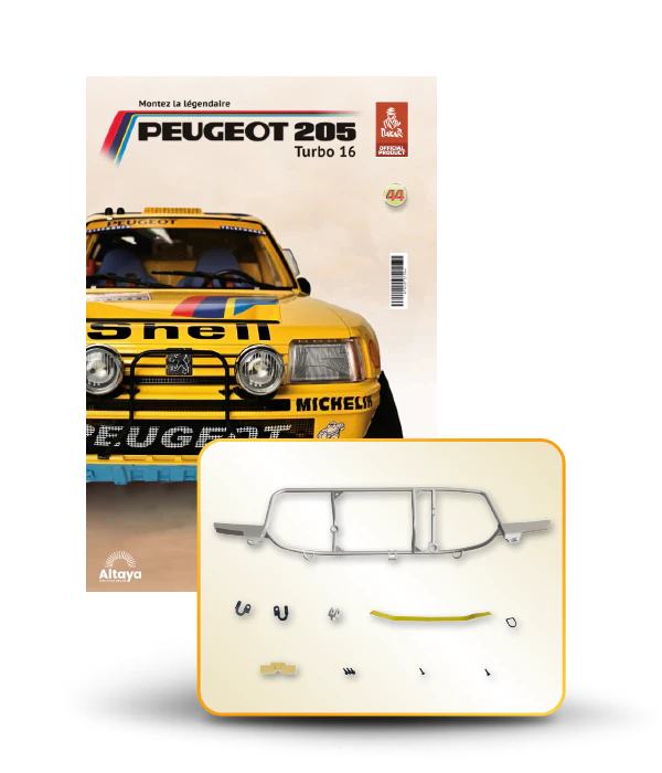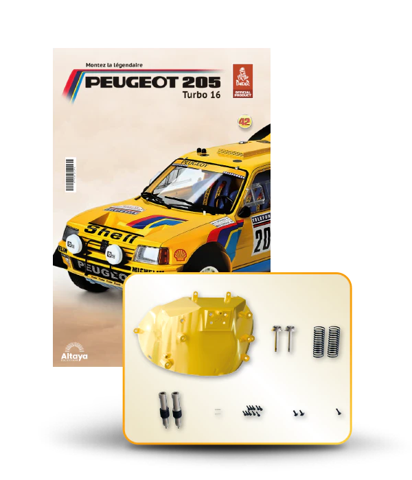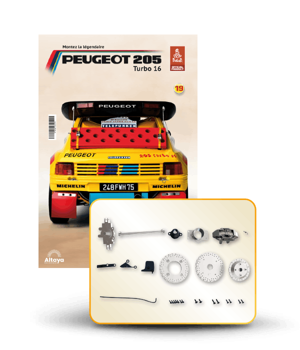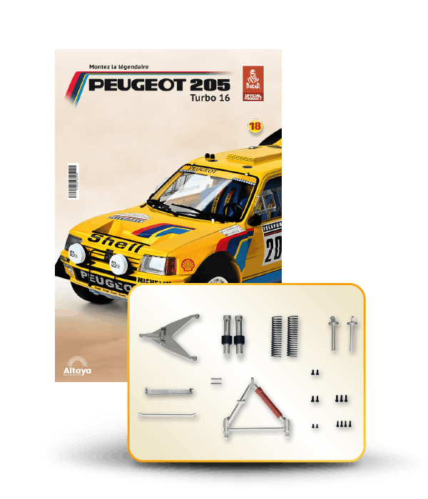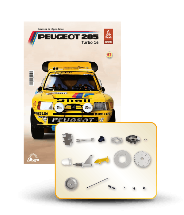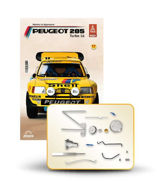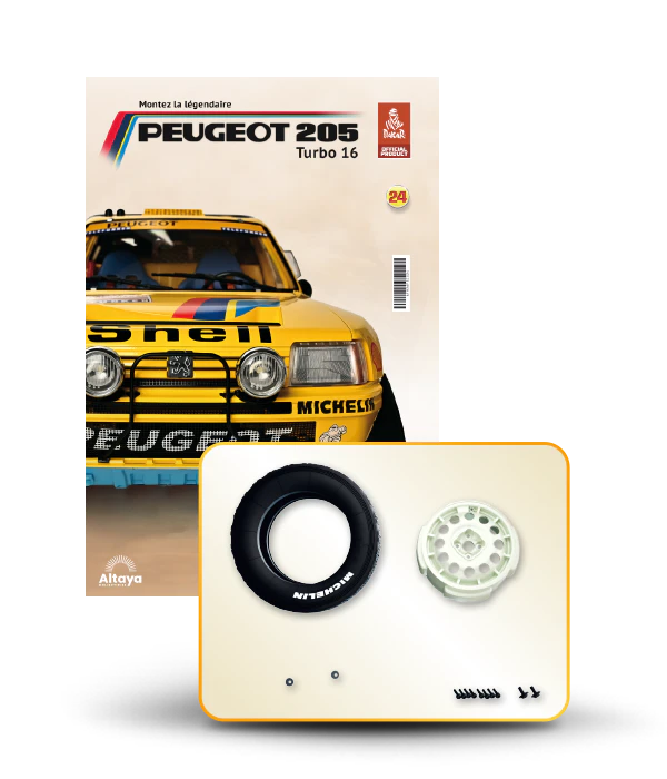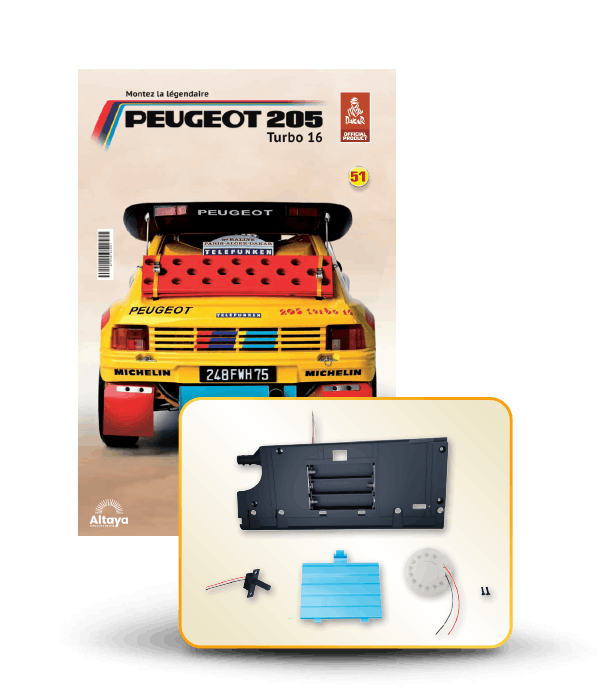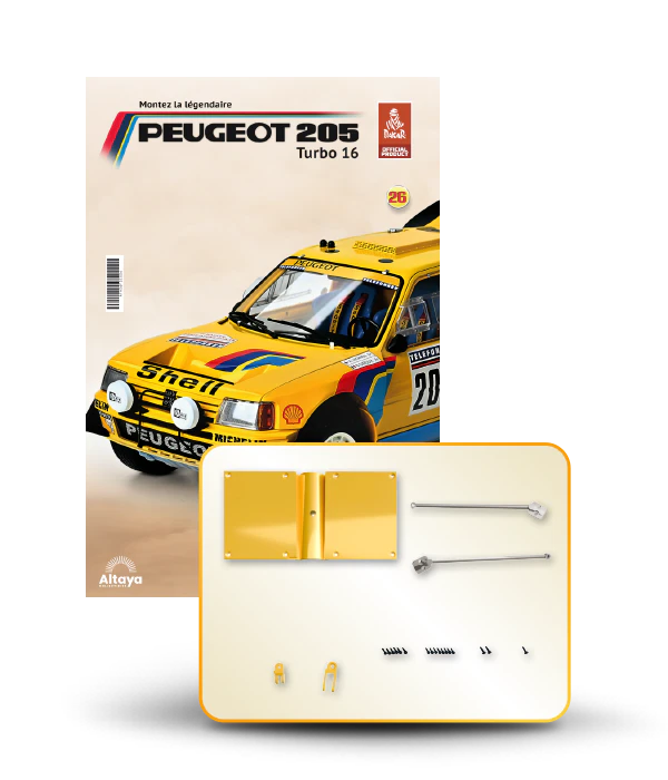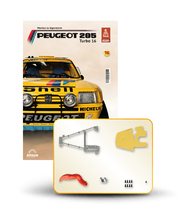 Vous pouvez désormais construire votre propre modèle à l'échelle 1/8 de la spectaculaire Peugeot 205 Turbo 16 Grand Raid, vainqueur du rallye Paris-Dakar 1987, pilotée par Ari Vatanen et Bernard Giroux. Ce modèle inédit vient agrandir la prestigieuse galaxie des modèles réduits à monter. Prenez plaisir l'assembler et à l'exposer dans un endroit bien visible de votre maison.