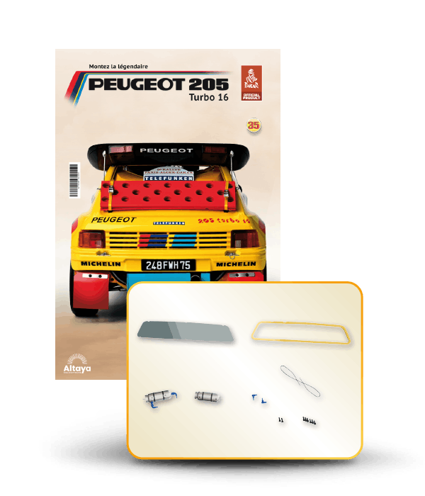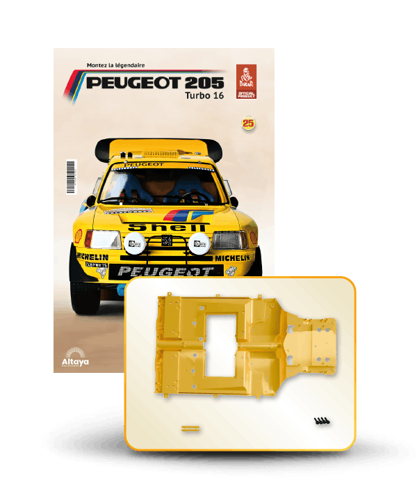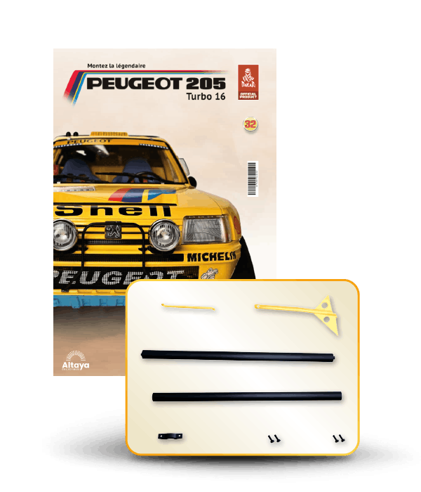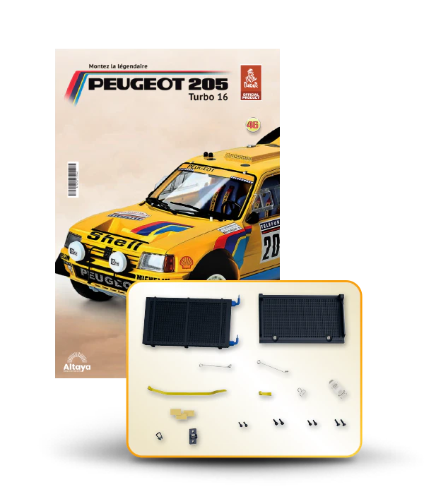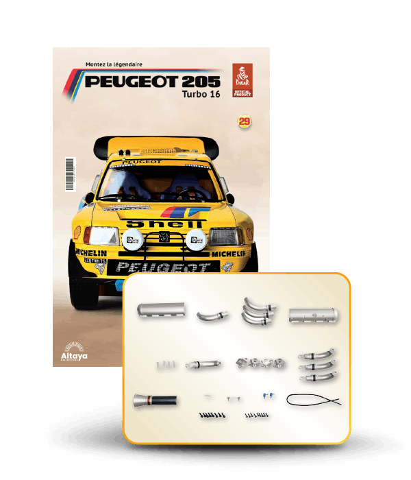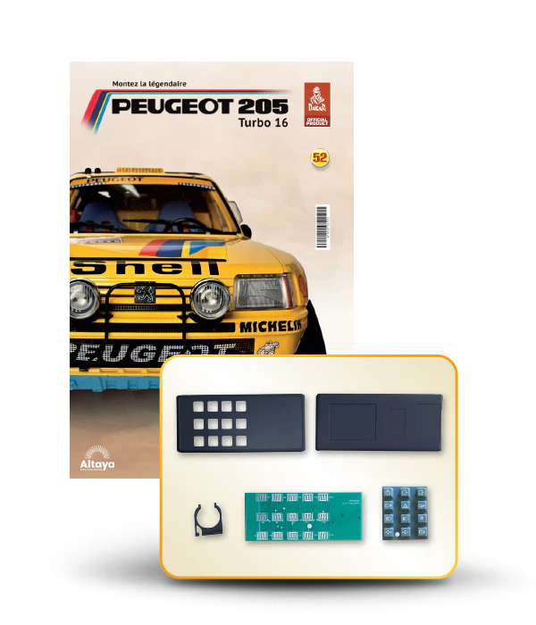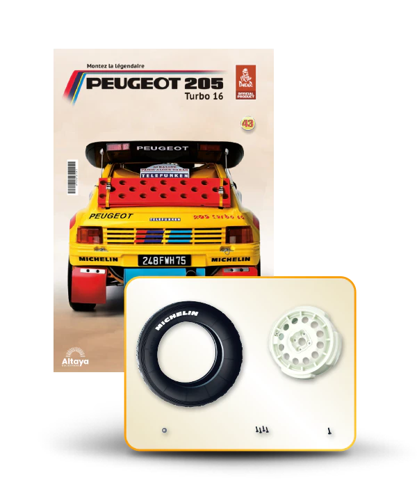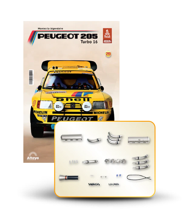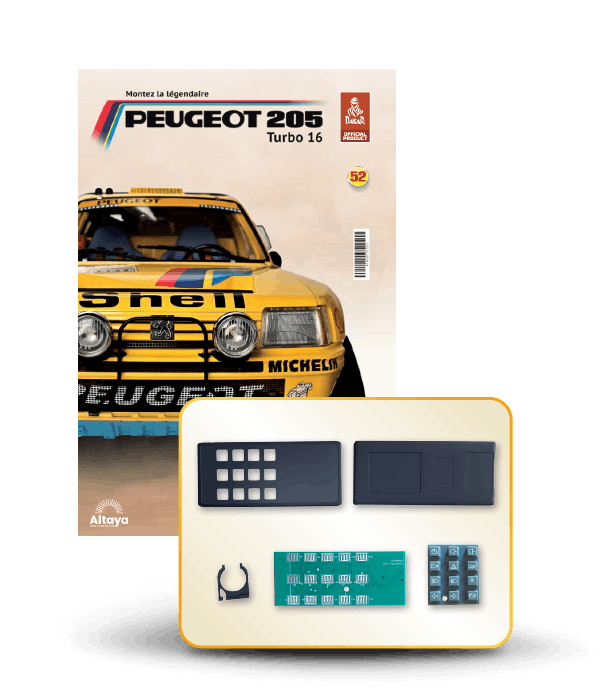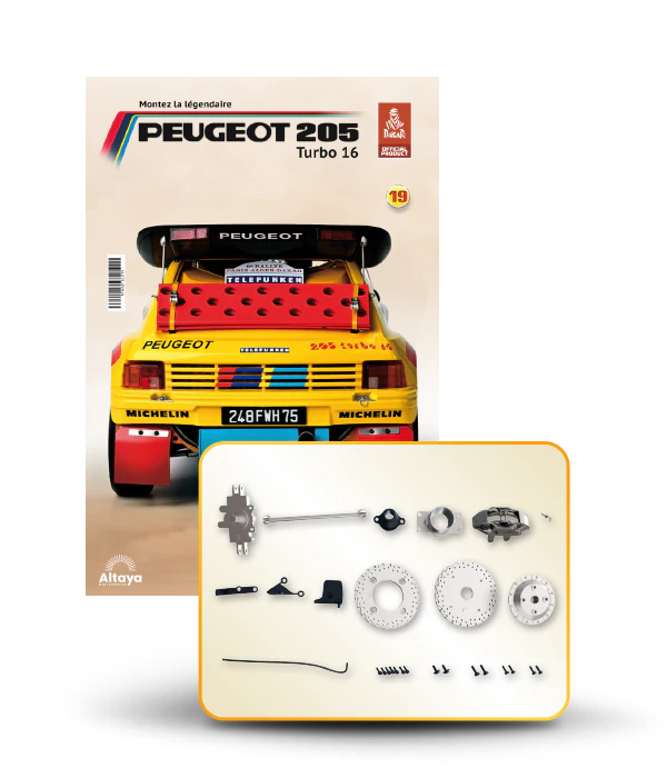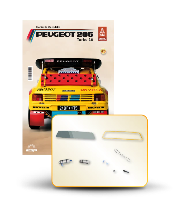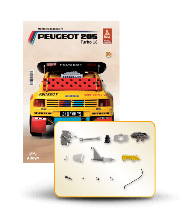 Vous pouvez désormais construire votre propre modèle à l'échelle 1/8 de la spectaculaire Peugeot 205 Turbo 16 Grand Raid, vainqueur du rallye Paris-Dakar 1987, pilotée par Ari Vatanen et Bernard Giroux. Ce modèle inédit vient agrandir la prestigieuse galaxie des modèles réduits à monter. Prenez plaisir l'assembler et à l'exposer dans un endroit bien visible de votre maison.