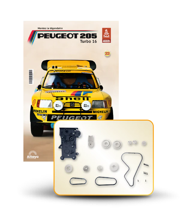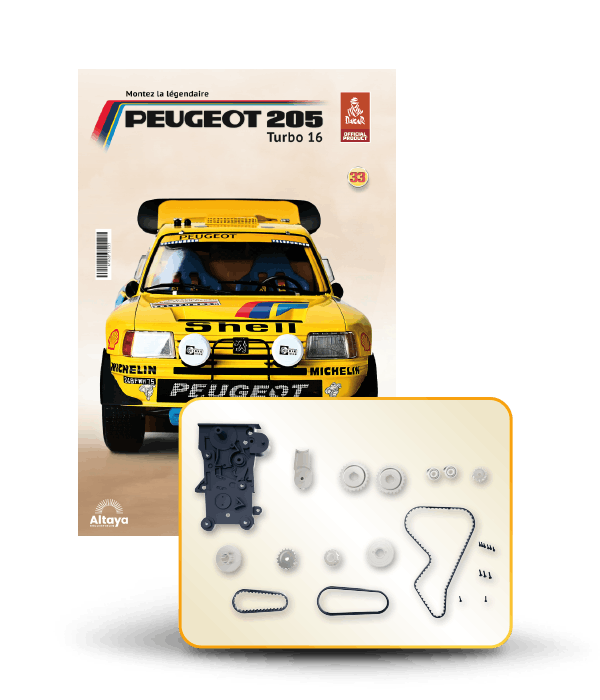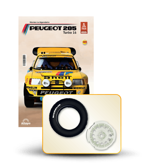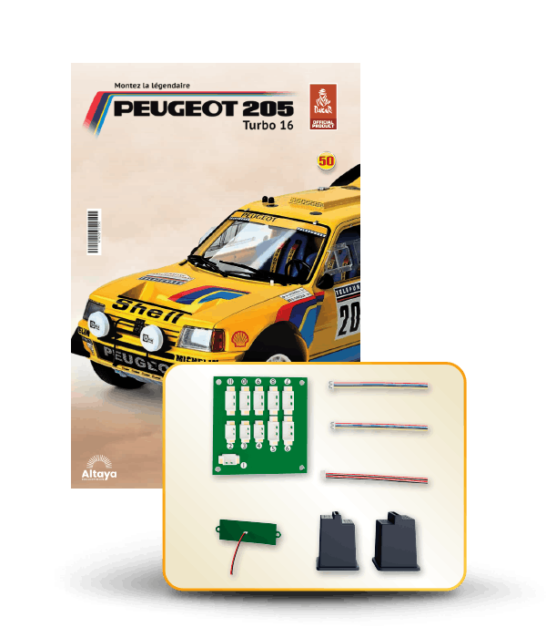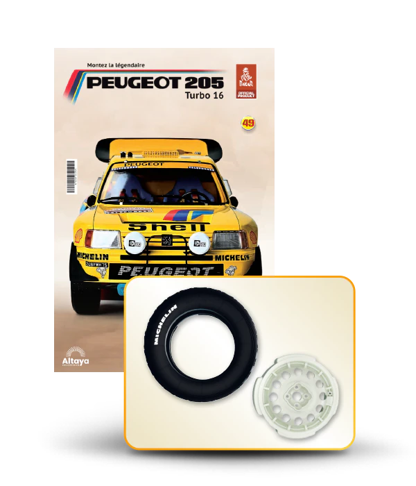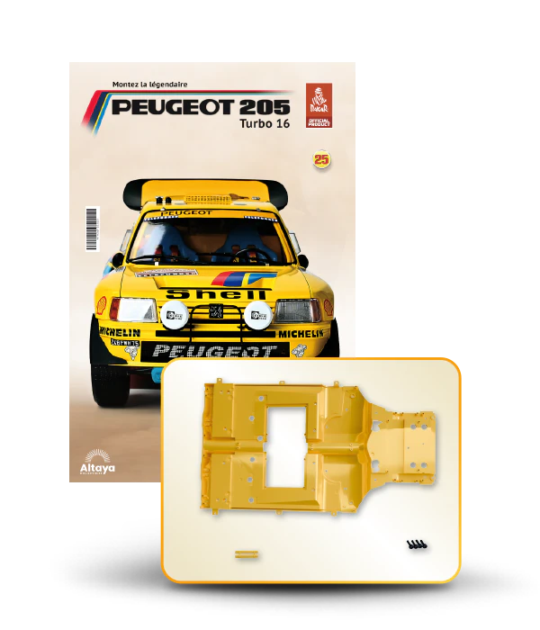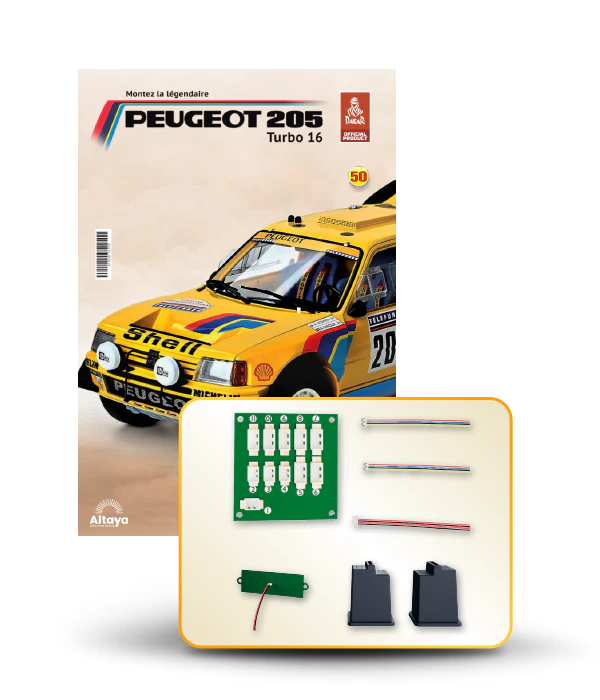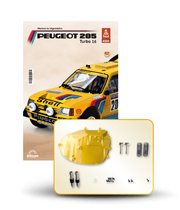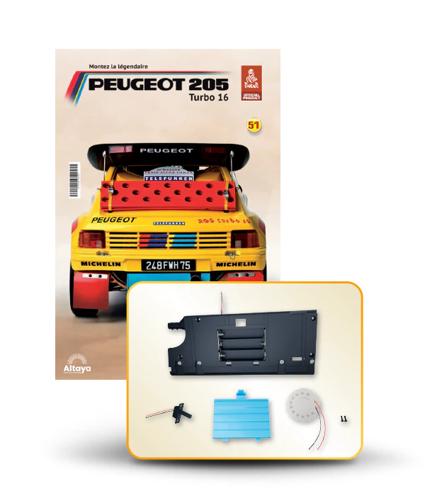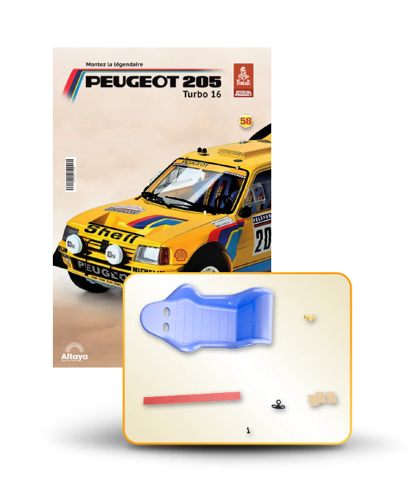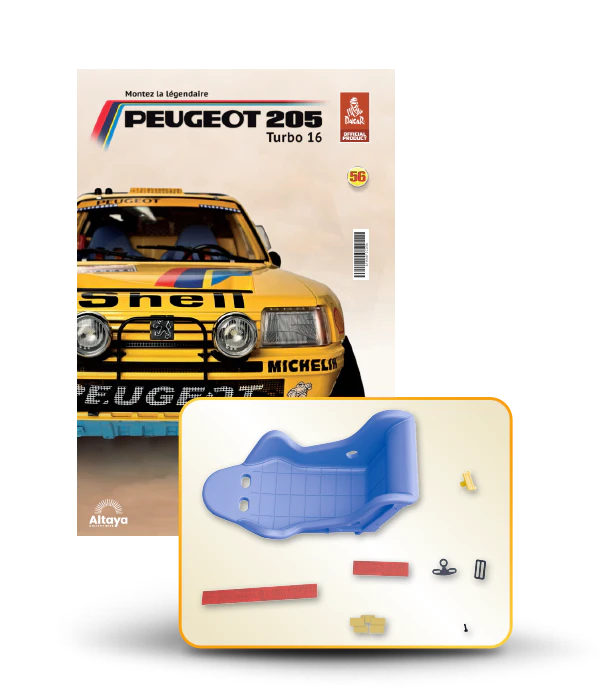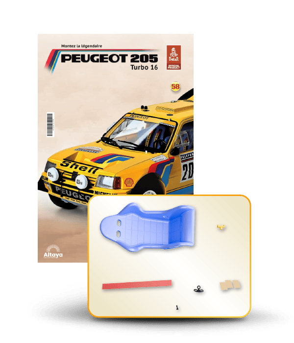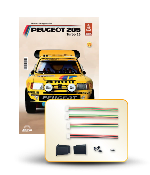 Vous pouvez désormais construire votre propre modèle à l'échelle 1/8 de la spectaculaire Peugeot 205 Turbo 16 Grand Raid, vainqueur du rallye Paris-Dakar 1987, pilotée par Ari Vatanen et Bernard Giroux. Ce modèle inédit vient agrandir la prestigieuse galaxie des modèles réduits à monter. Prenez plaisir l'assembler et à l'exposer dans un endroit bien visible de votre maison.