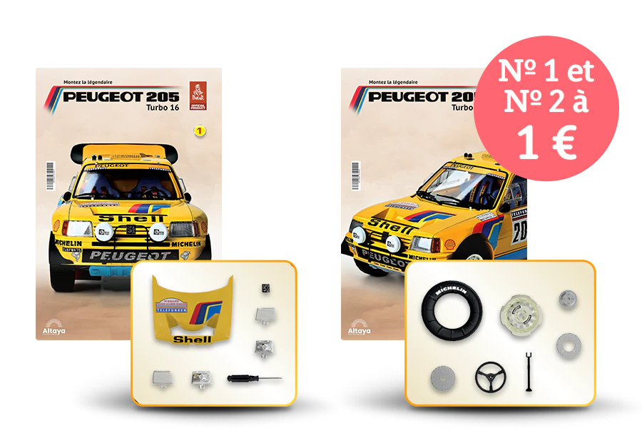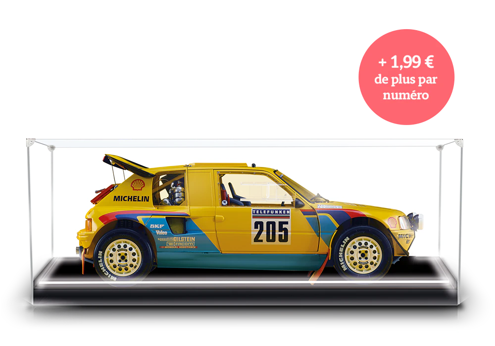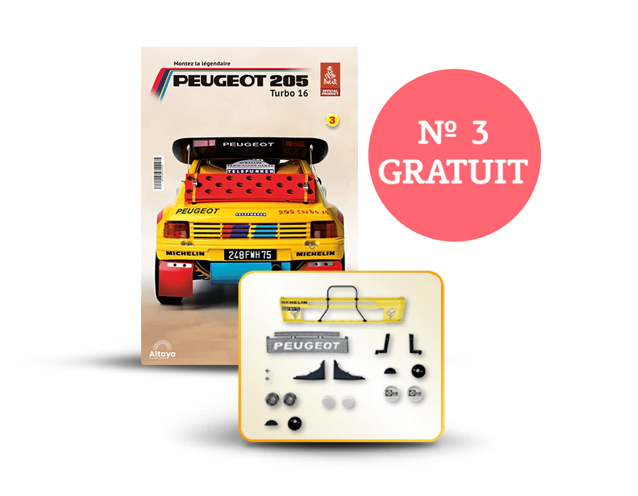 Vous pouvez désormais construire votre propre modèle à l'échelle 1/8 de la spectaculaire Peugeot 205 Turbo 16 Grand Raid, vainqueur du rallye Paris-Dakar 1987, pilotée par Ari Vatanen et Bernard Giroux. Ce modèle inédit vient agrandir la prestigieuse galaxie des modèles réduits à monter. Prenez plaisir l'assembler et à l'exposer dans un endroit bien visible de votre maison.