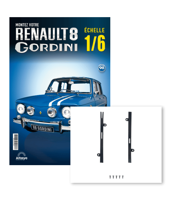 Ce modèle exceptionnel ne vous laissera pas indifférent. Lancée en 1964, la R8 Gordini est devenue l'une des voitures de sport les plus mythiques de Renault, capable d’atteindre une vitesse de pointe impressionnante de 175 km/h. Après avoir subi un lifting en 1966, la « Gorde » acquiert les bandes blanches et les quatre phares avant qui la rendent reconnaissable entre mille. La R8 fait partie aujourd’hui des voitures de course françaises d'après-guerre les plus recherchées. Construisez dès maintenant votre propre réplique en vous abonnant à cette magnifique collection.