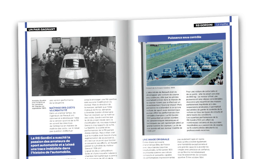 Une rubrique dédiée à la légendaire R8 Gordini et à son créateur, Amédée Gordini. Lancée en 1964, cette voiture a permis à toute une génération de ressentir l'adrénaline du sport automobile. Plus de 12 000 R8 Gordini ont été vendues entre 1964 et 1970, ce qui témoigne du génie de Gordini.