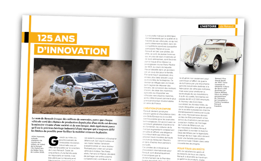 Un retour sur certains des moments forts des 100 ans d’histoire de la marque, une histoire qui a commencé lorsque le jeune Louis Renault rêvait de créer sa propre automobile. Au fil des ans, les conceptions innovantes de Renault ont donné naissance à des voitures qui ont à jamais marqué les esprits.